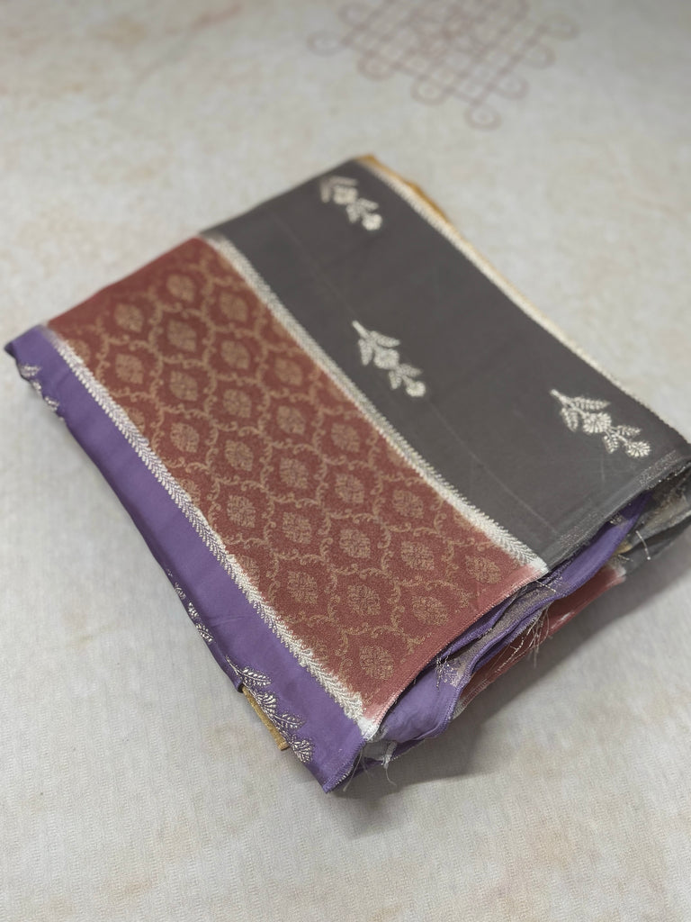 This borderless saree features neatly finished selvedge edges, giving it a modern appeal while keeping its classic charm. It comes with a matching blouse designed with zari buttas and a zari border on the sleeves, perfectly complementing the saree’s elegant details. Ideal for festive events and cultural occasions, this saree reflects timeless craftsmanship and refined style.