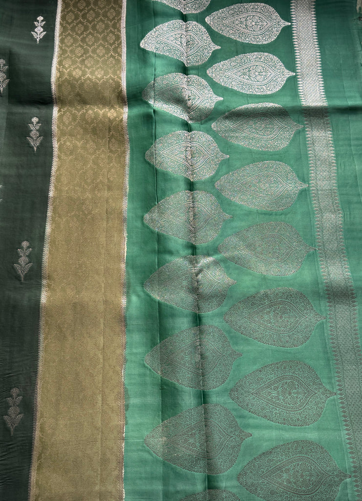 Step into timeless elegance with this beautiful Rangkat Pure Mashru Silk Saree. Woven using the traditional Rangkat technique, each stripe is individually handwoven, creating a striking blend of vibrant colors across the body. The saree is richly detailed with golden zari patterns, bringing a soft shimmer and visual depth. The pallu features delicate gold zari leaf motifs, adding a graceful and sophisticated touch.