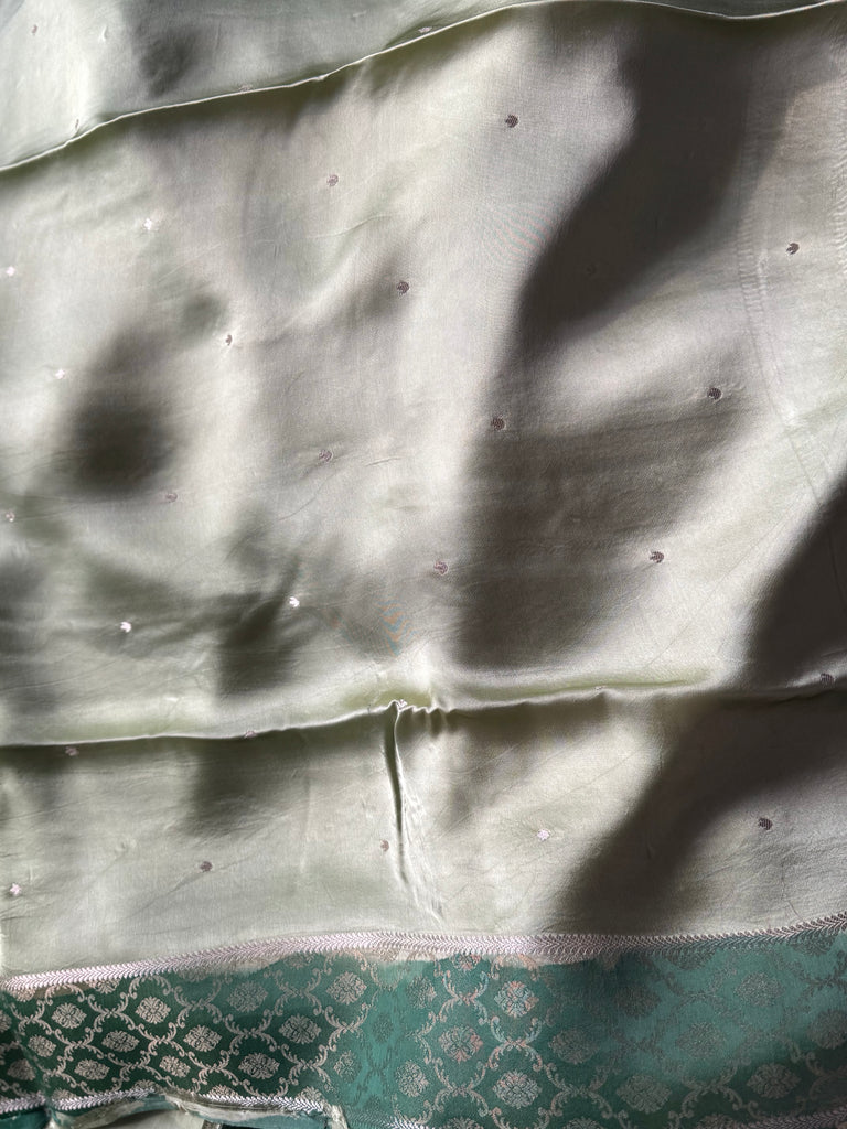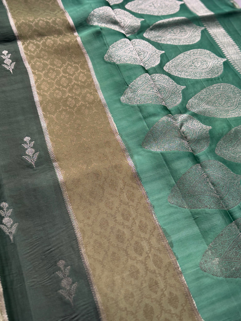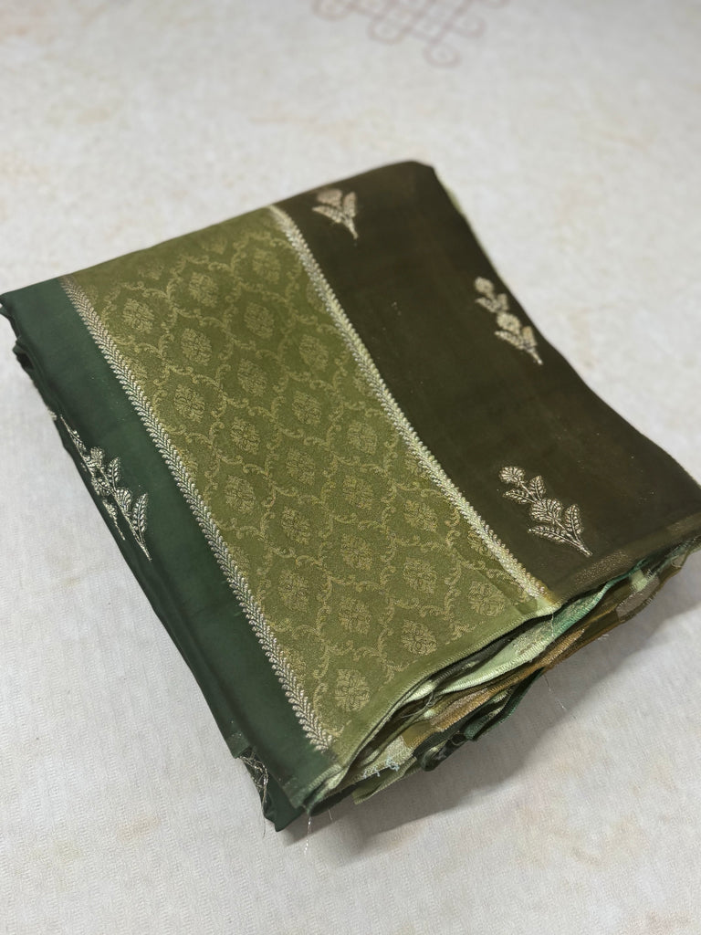 Designed without borders, the saree is finished with neatly stitched selvedge edges that lend it a clean, contemporary look. It is paired with a coordinated blouse featuring zari buttas and a zari-trimmed sleeve, perfectly complementing the overall design. Ideal for festive gatherings and traditional celebrations, this saree is a beautiful expression of heritage craftsmanship and modern elegance.