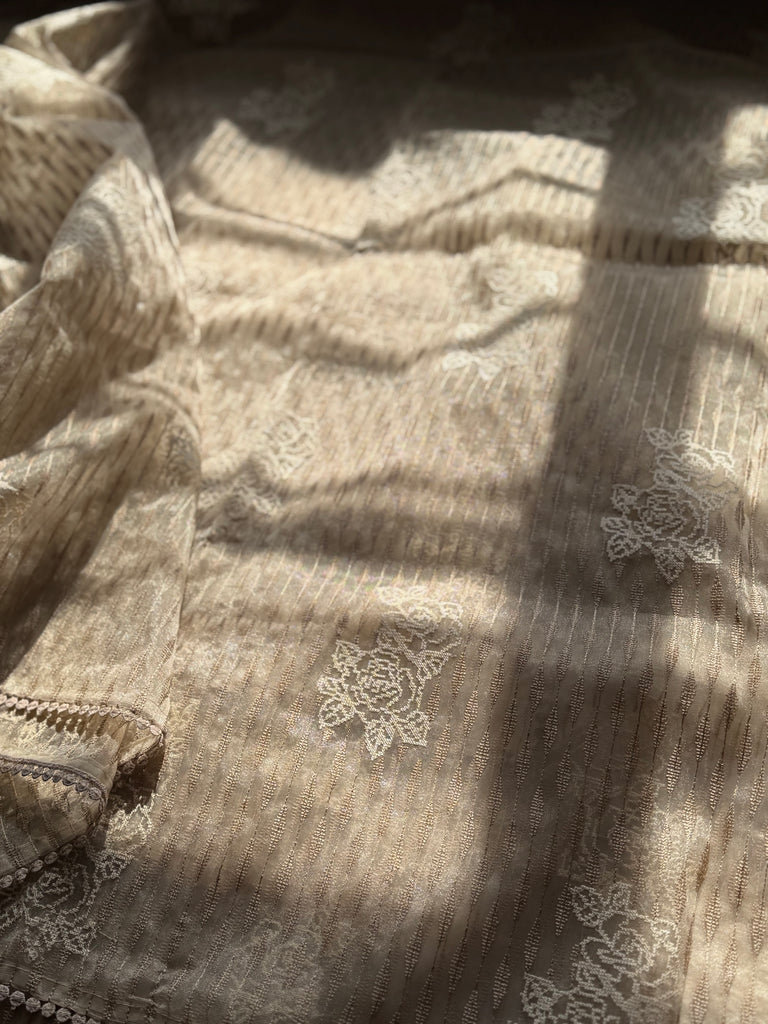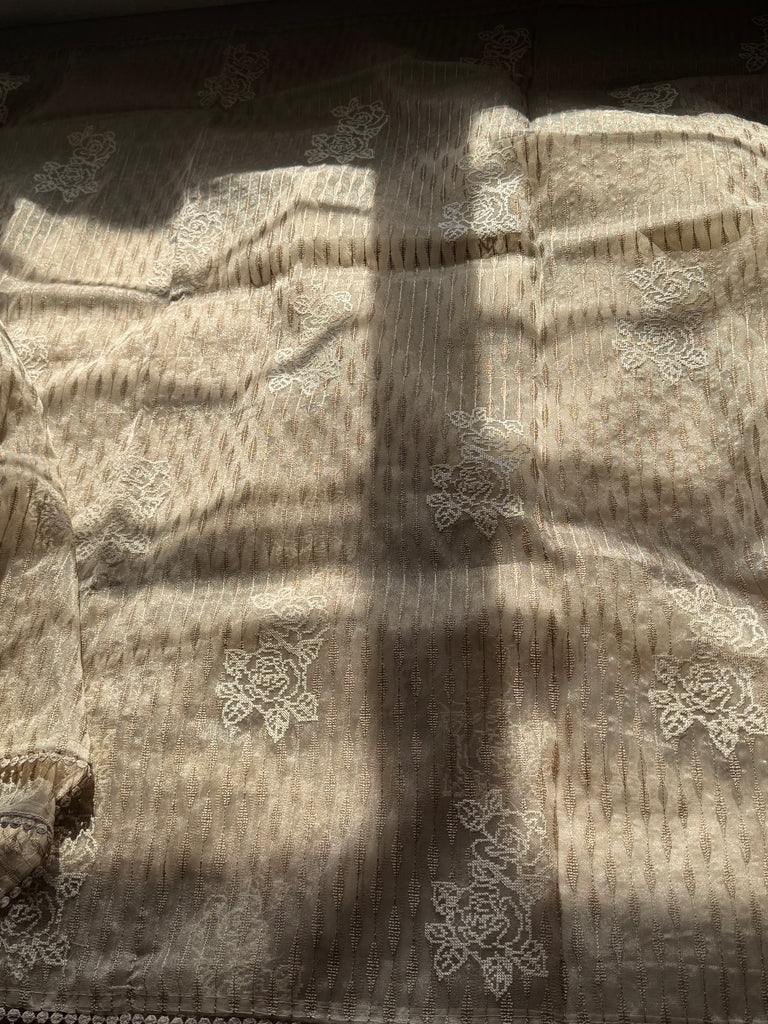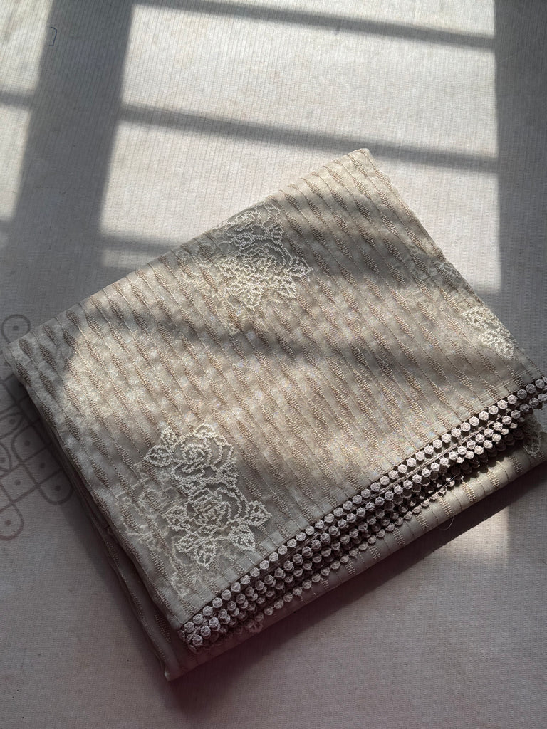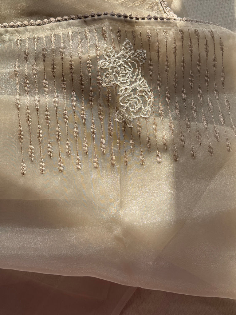 Elevate your ethnic wardrobe with this elegant Tissue Saree adorned with intricate floral embroidery. Crafted from lightweight tissue fabric, this saree drapes beautifully, offering a subtle sheen and a graceful silhouette. The delicate embroidery, featuring blooming flowers, adds a touch of artistry and charm, making it perfect for festive occasions, celebrations, or special gatherings. Comes with running blouse fabric.