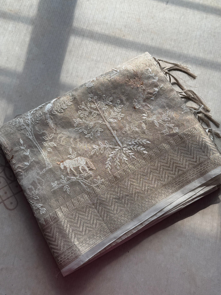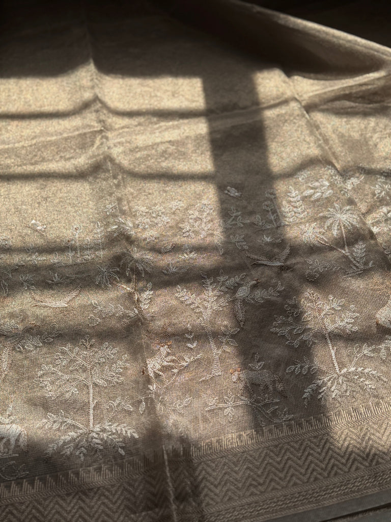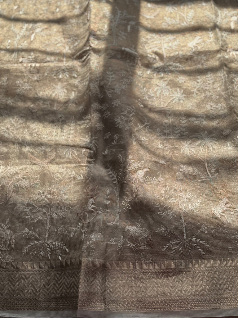 Elevate your ethnic wardrobe with this elegant Tissue Saree adorned with intricate bird and floral embroidery. Crafted from lightweight tissue fabric, this saree drapes beautifully, offering a subtle sheen and a graceful silhouette. The delicate embroidery, featuring birds and blooming flowers, adds a touch of artistry and charm, making it perfect for festive occasions, celebrations, or special gatherings. Comes with running blouse fabric.