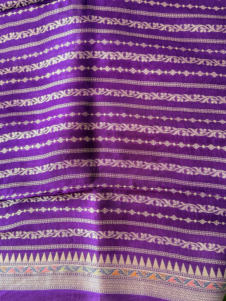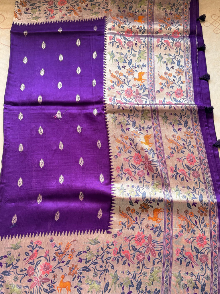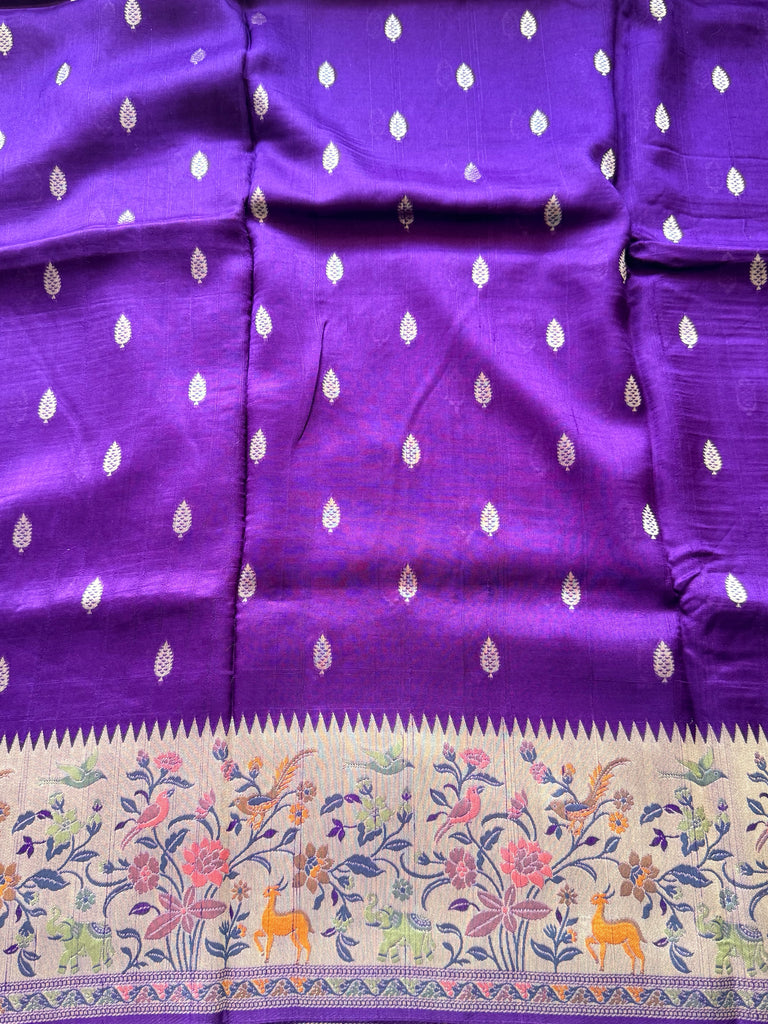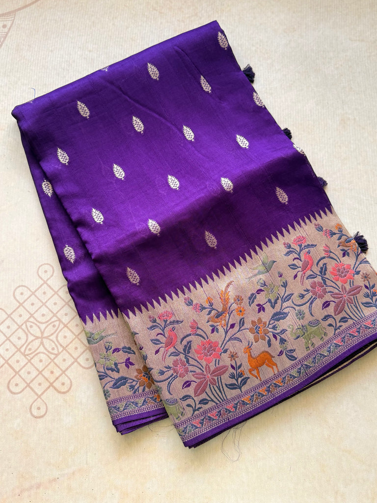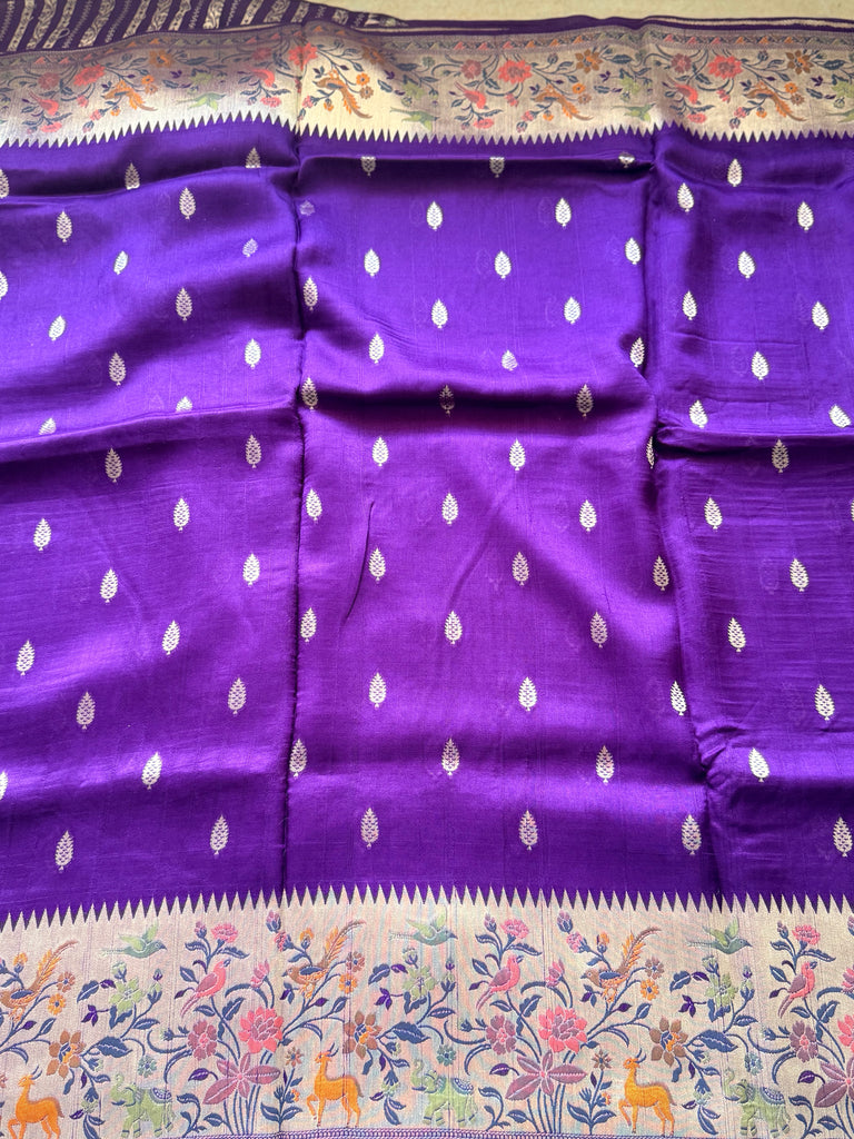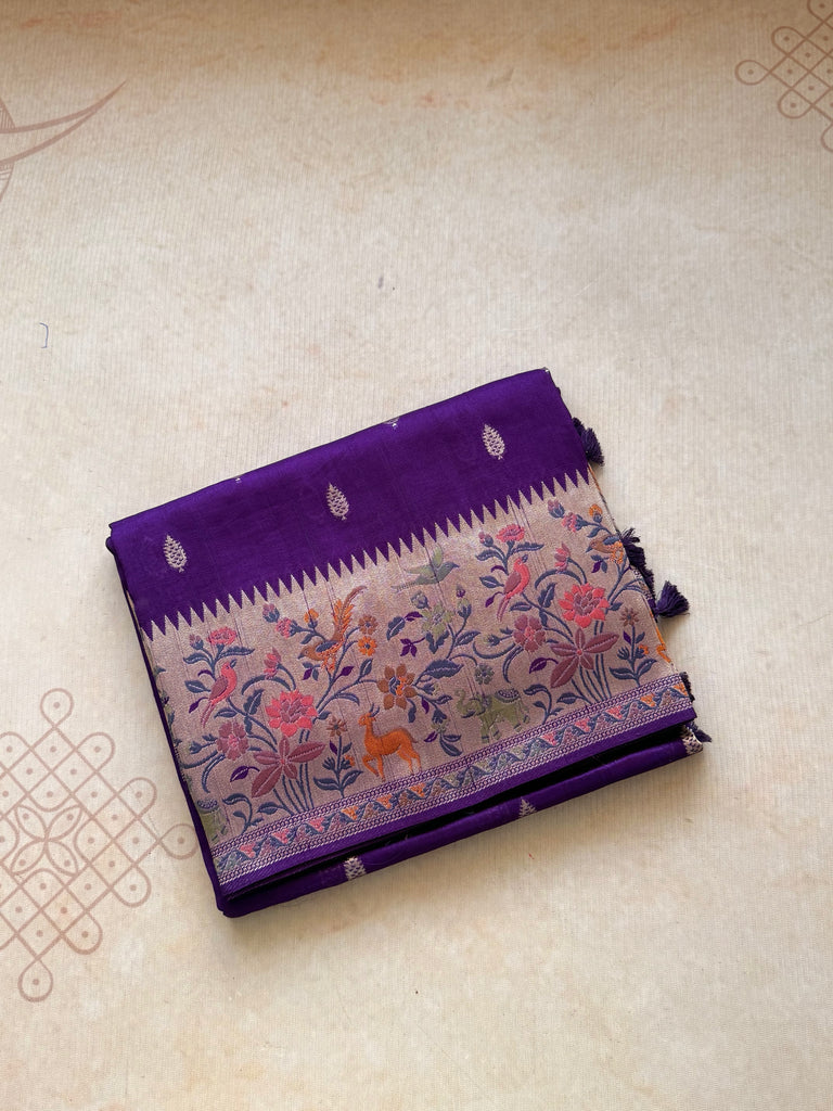 Drape yourself in elegance with this stunning Violet Pure Matka Silk Saree. The body is delicately adorned with zari buttas all over, adding a subtle shimmer to the rich silk base. Its heavily crafted meenakari border showcases intricate artistry, seamlessly extending into the grand pallu for a regal finish.