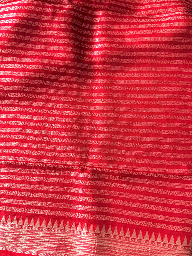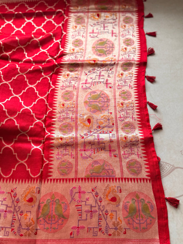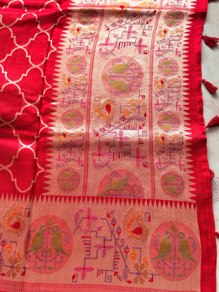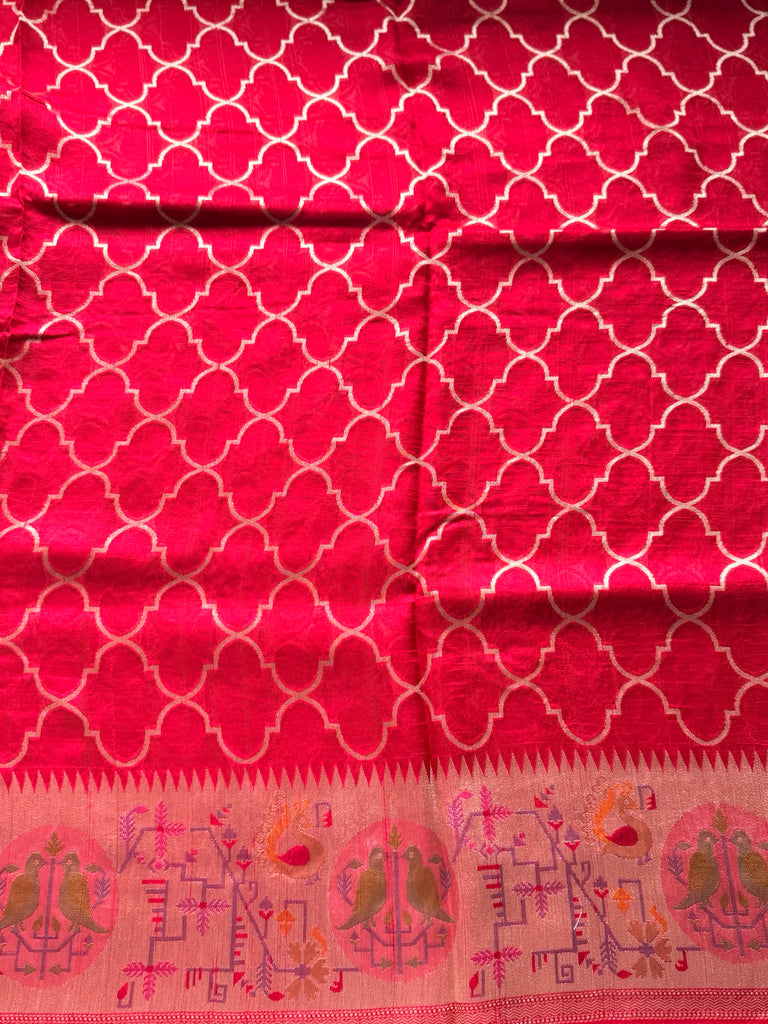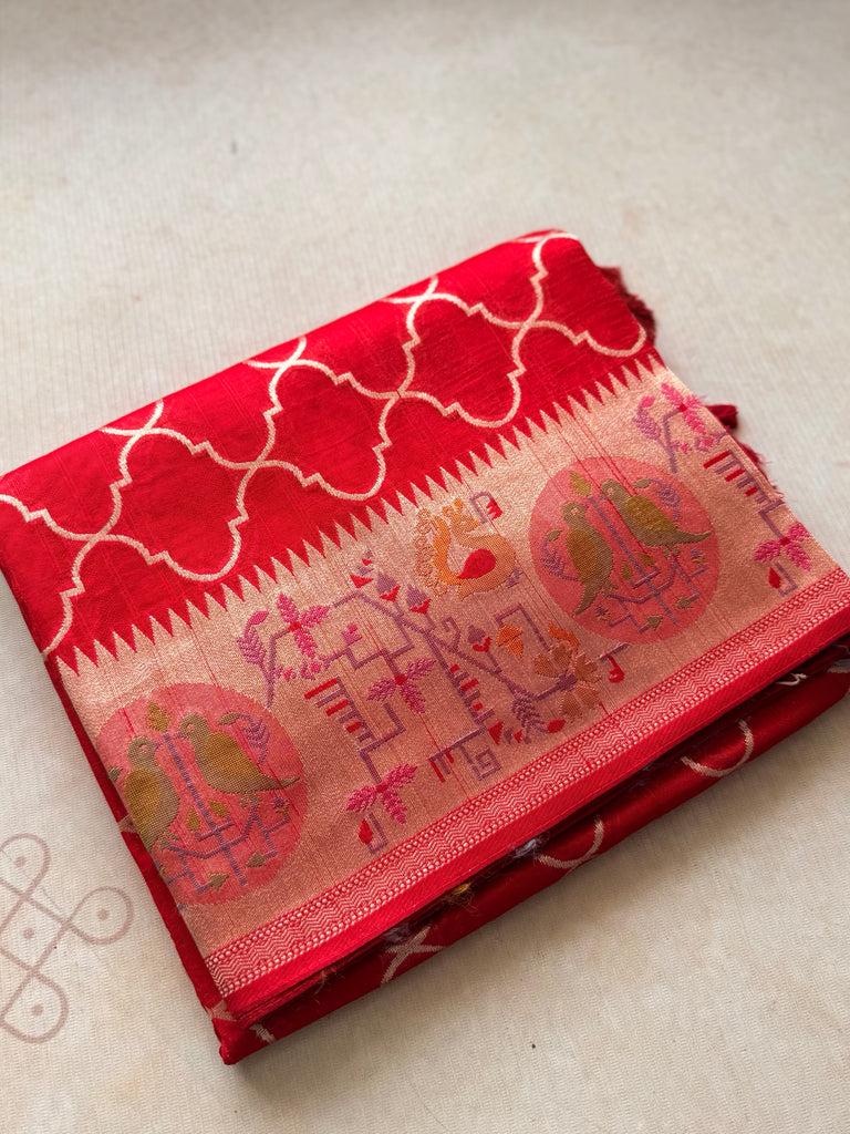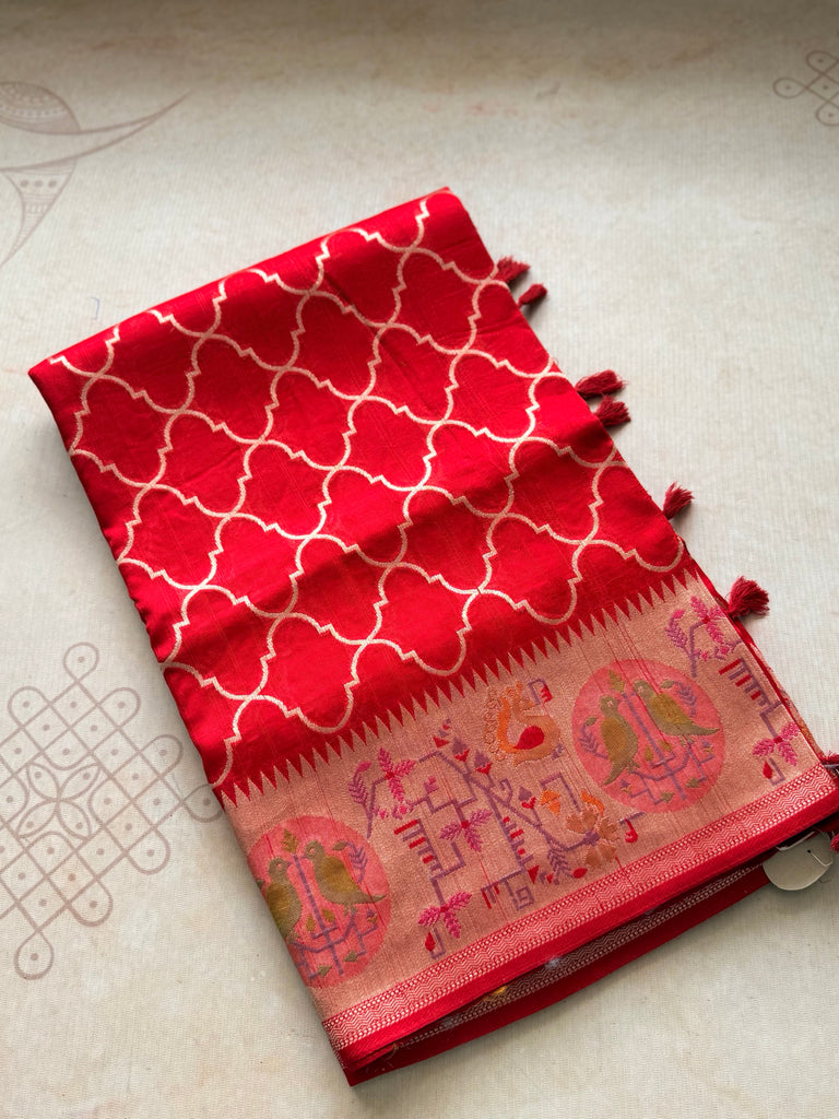 Crafted in luxurious pure matka silk, this saree comes in a striking red hue adorned with an exquisite jaal weave across the body. The saree features a richly designed paithani border with meenakari detailing, carrying forward the heritage artistry in every thread. The pallu continues the grandeur of the border, making it heavily ornate and regal. Completing the ensemble is a blouse with elegant zari lines and traditional designs, perfectly balancing richness with grace.