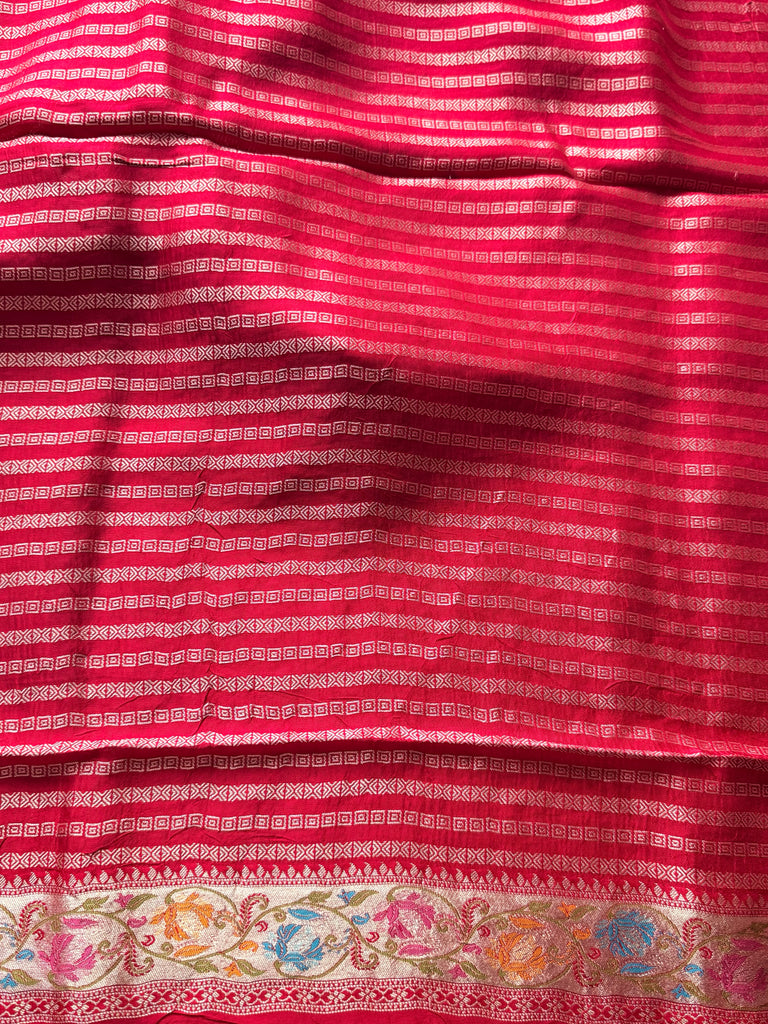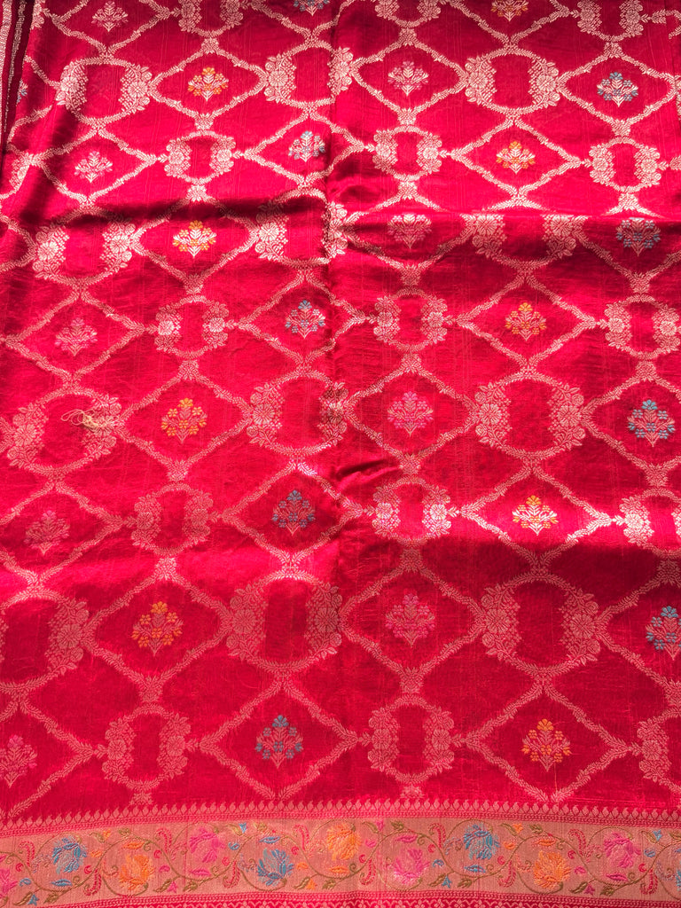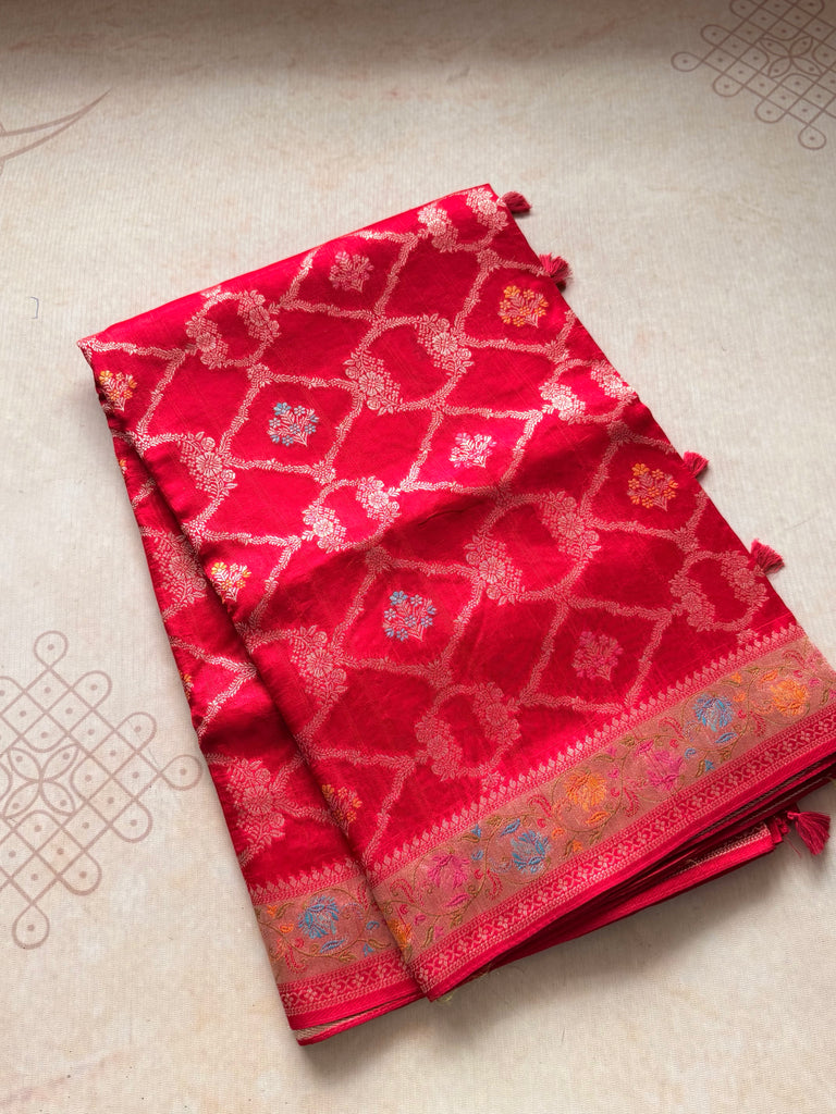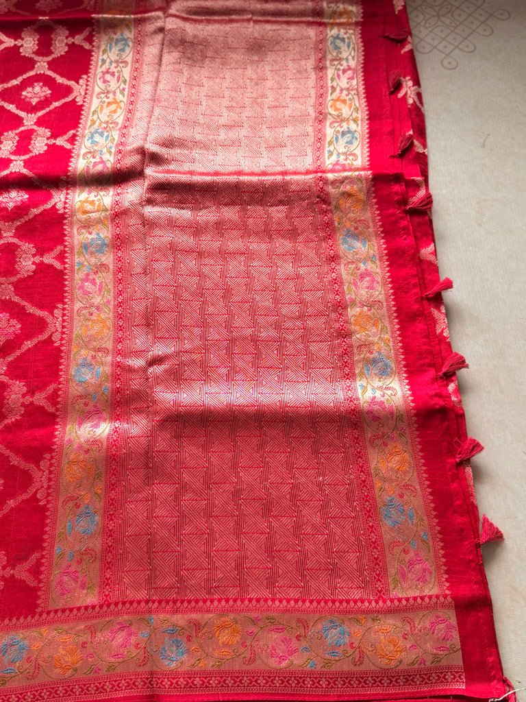 This saree is woven in pure matka silk in a rich red shade, featuring an elegant all-over jaal pattern. The floral buttas within the jaal are accentuated with meenakari detailing, lending depth and vibrance to the weave. Its border showcases traditional motifs with intricate meenakari work, enhancing the saree’s regal appeal. The pallu is adorned with a geometric-inspired zari design, framed by zari borders on both edges, creating a harmonious finish. The ensemble is completed with a blouse featuring zari-detailed lines and beautifully woven borders with meenakari accents—a perfect balance of tradition and sophistication.