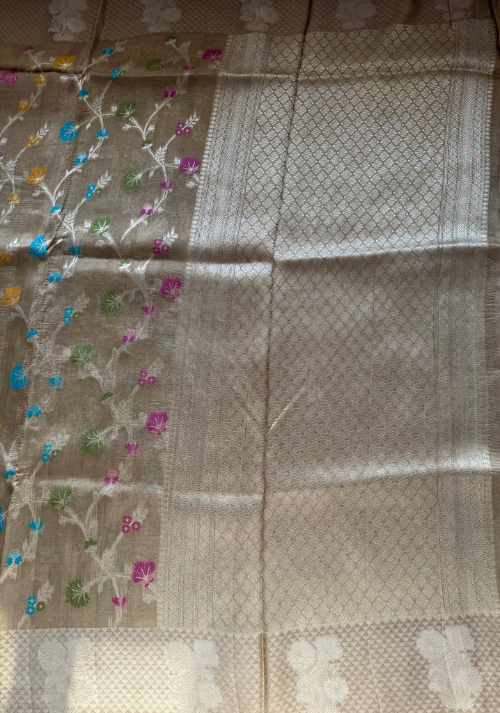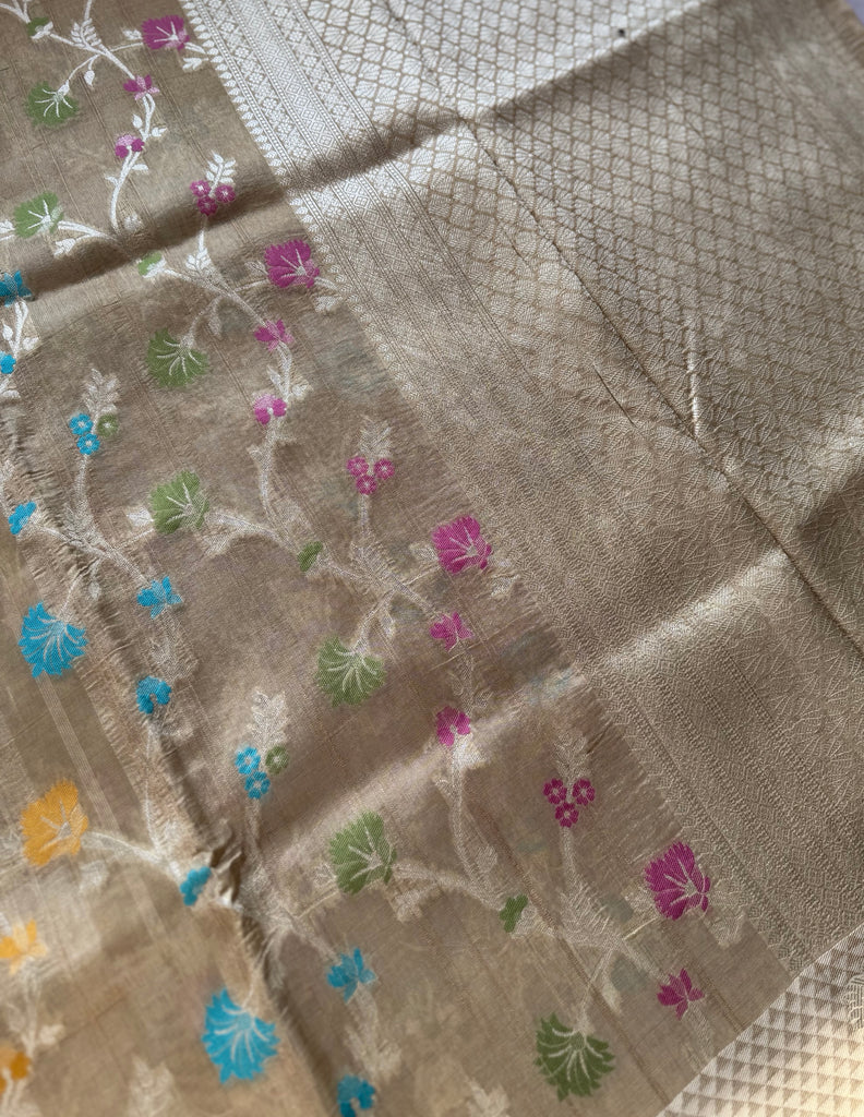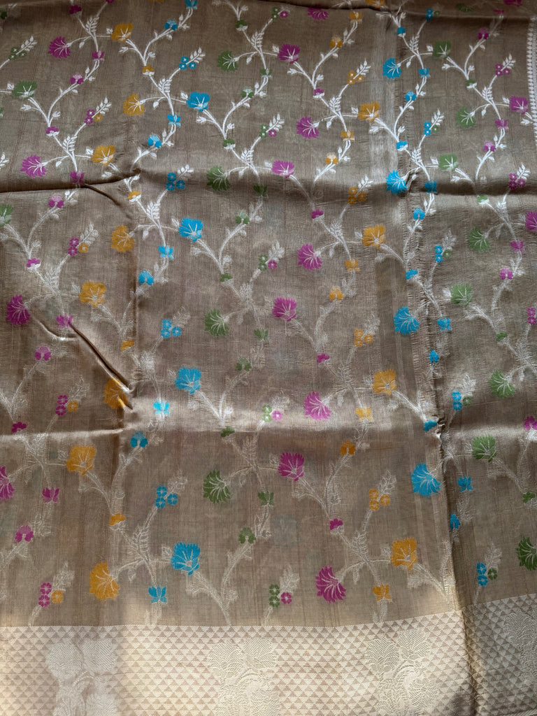 Exude understated grace with this elegant Beige Matka Tussar Banarasi Silk Saree, a refined statement of classic beauty and intricate craftsmanship. The body features a beautifully woven jaal pattern, enriched with zari accents and vibrant colour meenakari work, creating a subtle yet artistic texture throughout.