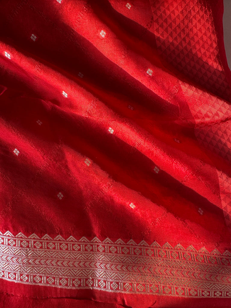 Paired with a contrasting Red blouse featuring elegant gold zari buttas, this saree strikes the perfect balance between tradition and sophistication—ideal for weddings, festive gatherings, or cultural celebrations.