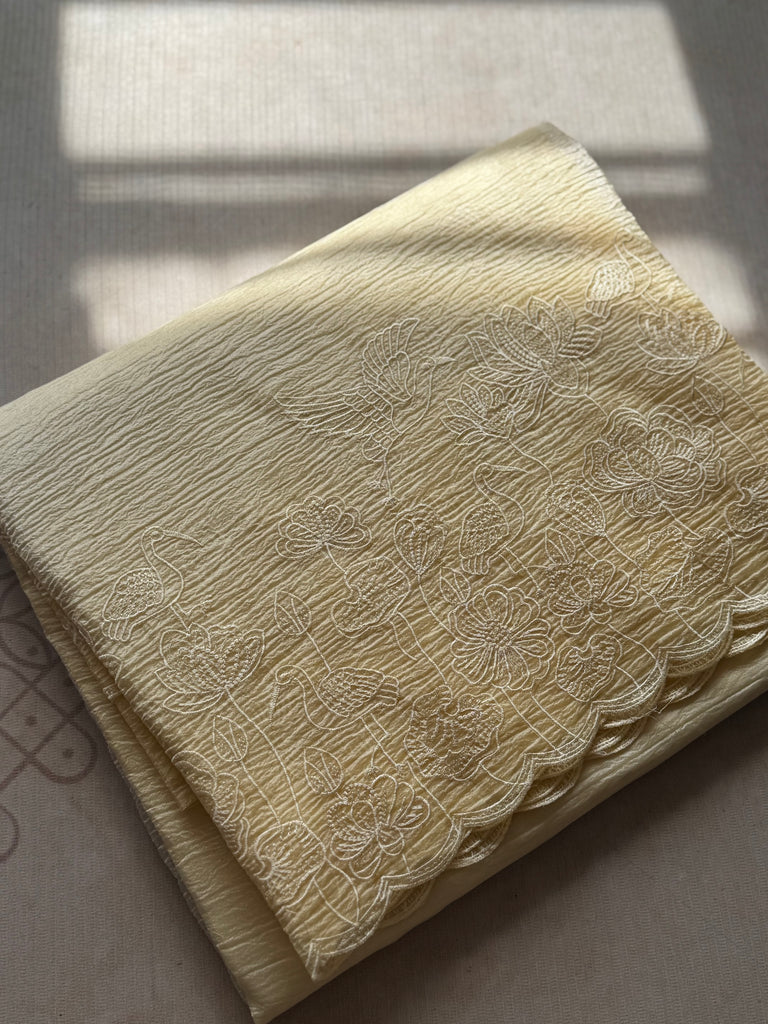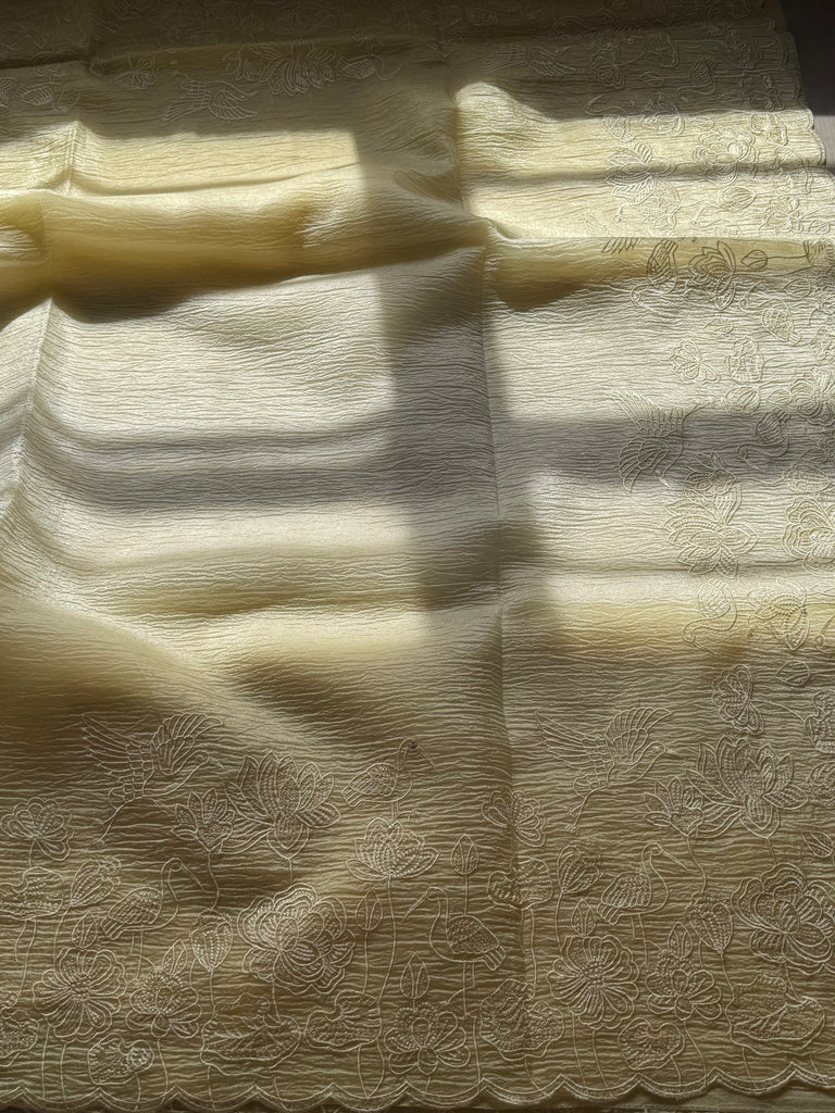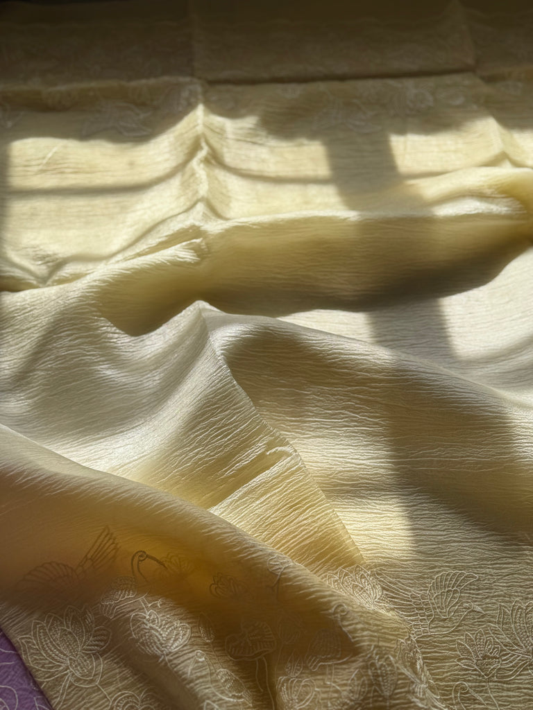 Delicate hand embroidery adorns the fabric with intricate motifs of cranes, lotus flowers, and flowing vines, adding a touch of timeless artistry. The micro-pleated texture not only gives the saree a modern flair but also ensures effortless draping with a lightweight, graceful fall.