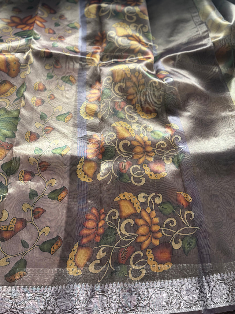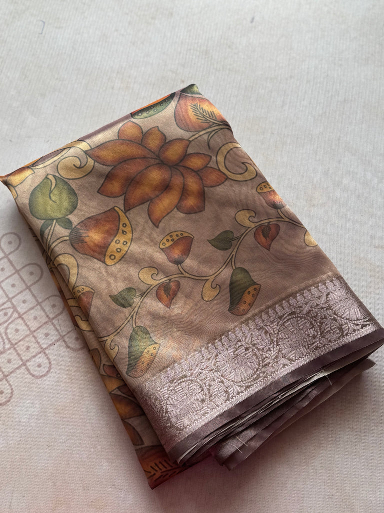 Grace your wardrobe with this exquisite organza saree, beautifully adorned with digital floral prints in rich earthy tones. The saree features bold lotus motifs and intricate leafy vines that exude timeless elegance. A subtle silver zari border adds a refined shimmer, perfectly balancing tradition with modern artistry. Lightweight and graceful, this saree drapes effortlessly, making it ideal for festive occasions or elegant gatherings.