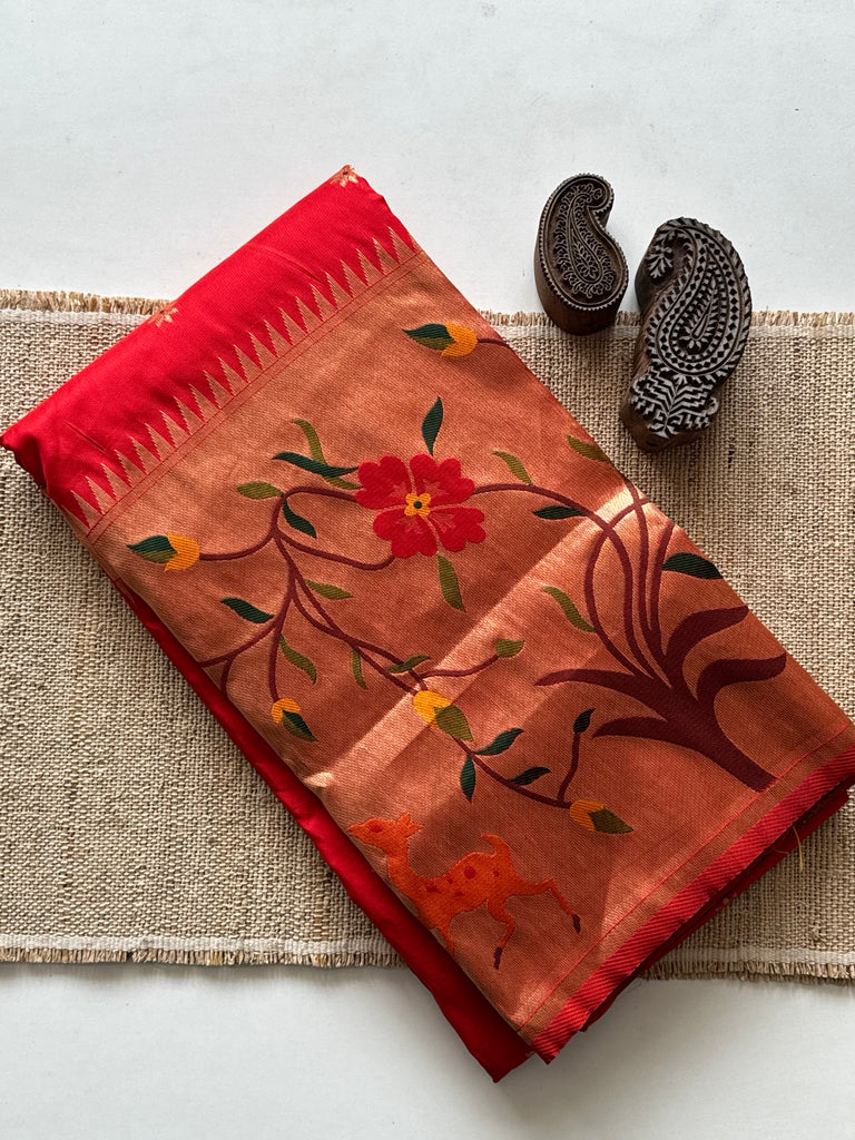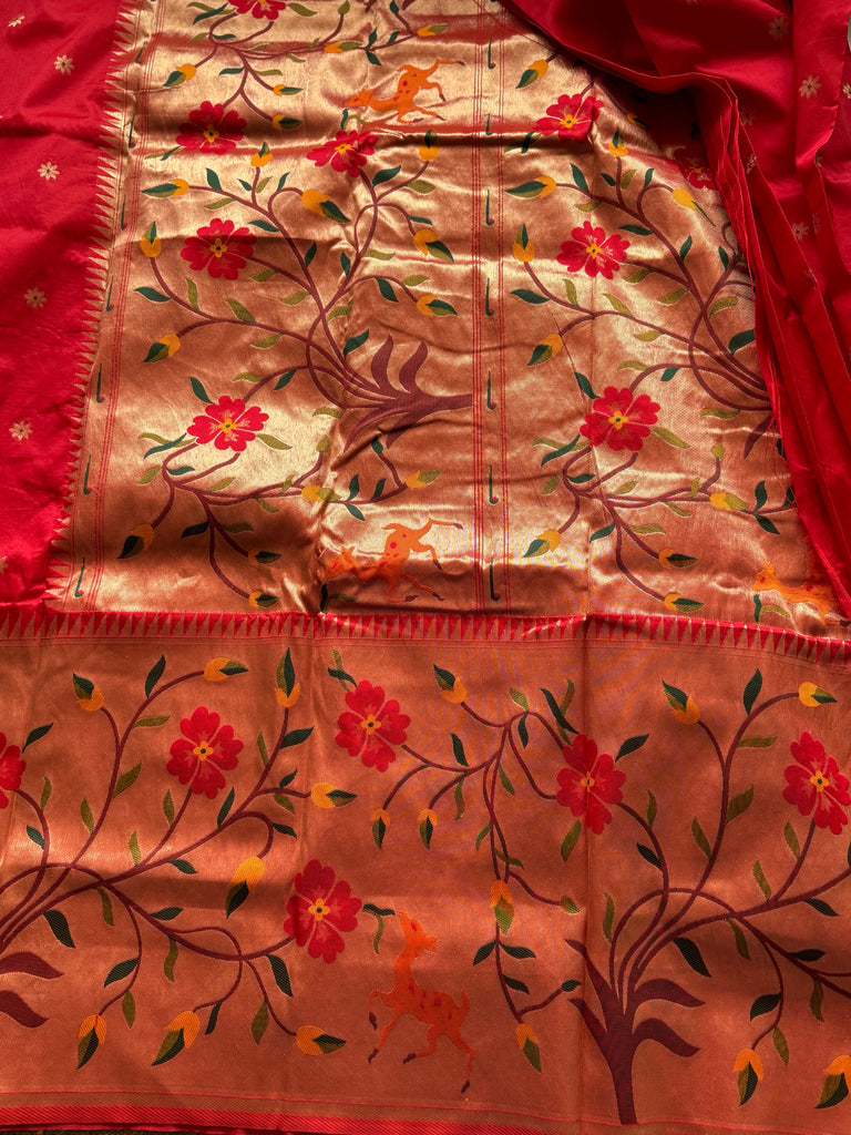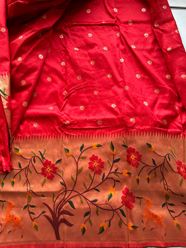 Beautiful Paithani Saree is the epitome of elegance, perfect for festivals and special occasions.Blended silk Paithani saree with stunning zari detailings in bright tones.