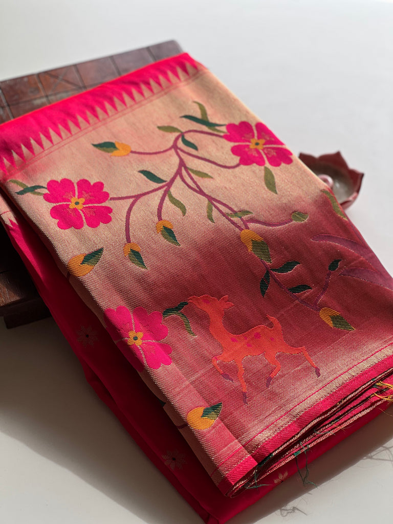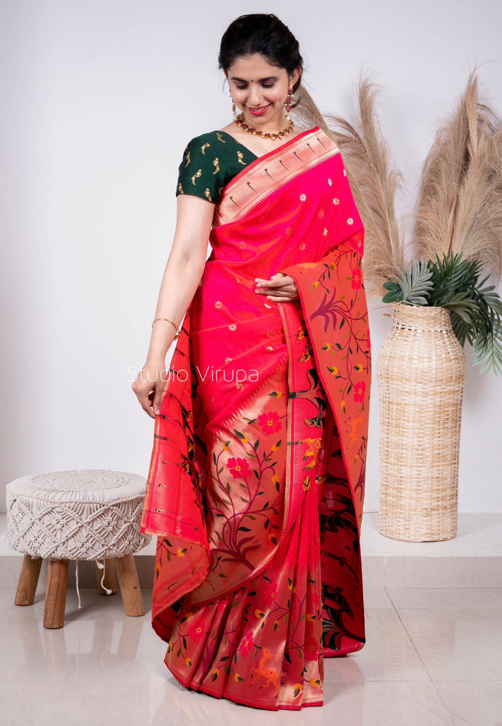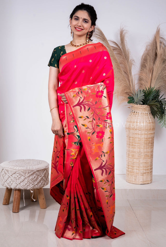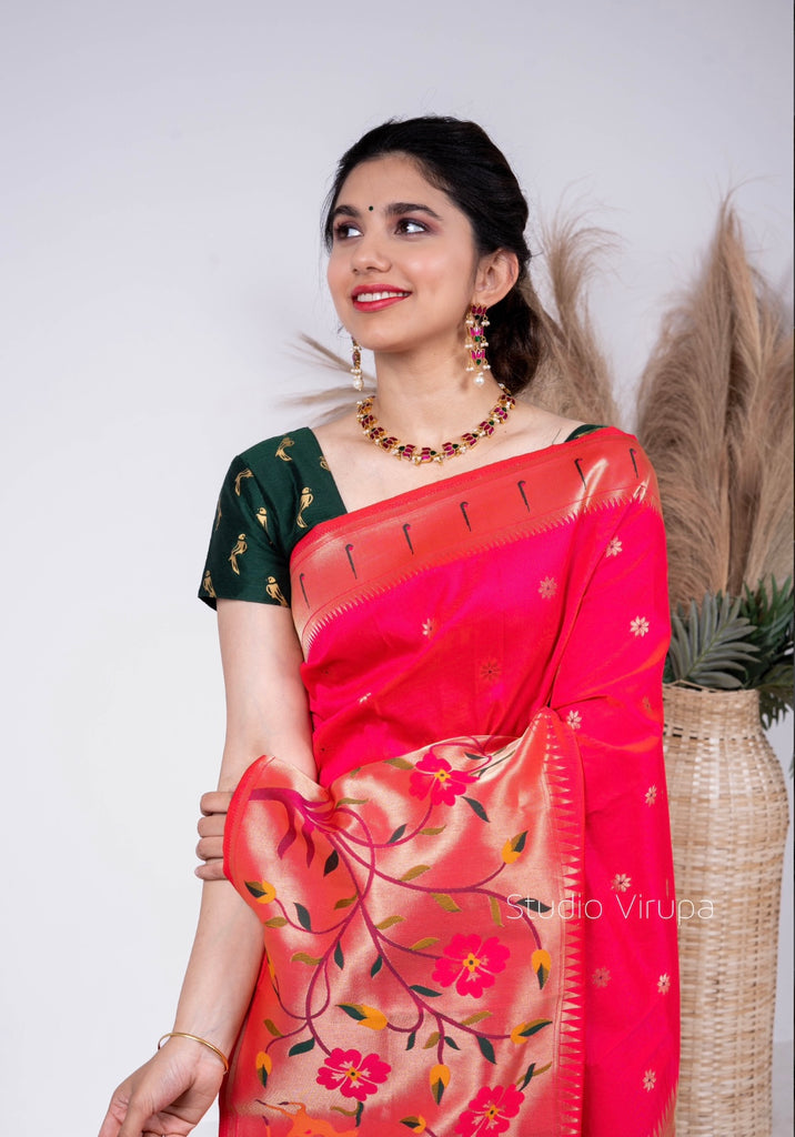 Hot pink Paithani Comes with running blouse,as same as the contrasting green blouse worn by the model