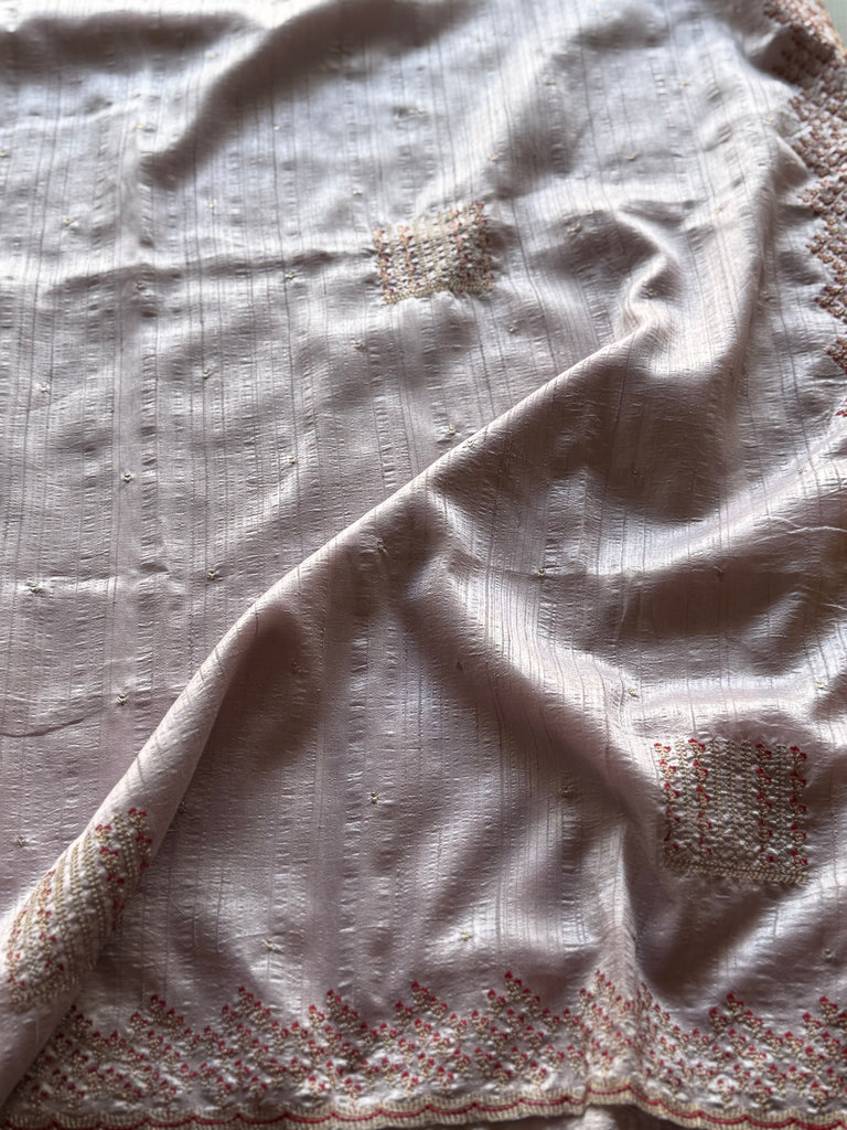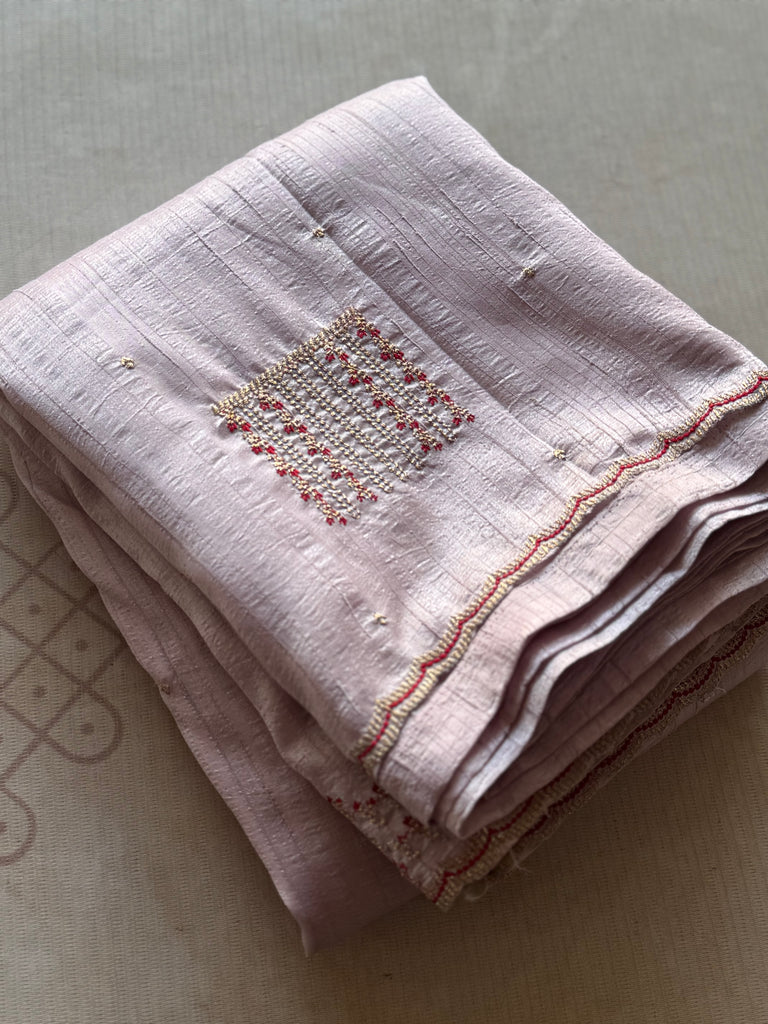 Crafted for lovers of understated elegance, this Pastel Jute Tussar Saree embodies refined simplicity and artisanal beauty. The naturally textured jute tussar silk base lends a soft sheen and airy drape, making it ideal for both comfort and sophistication.