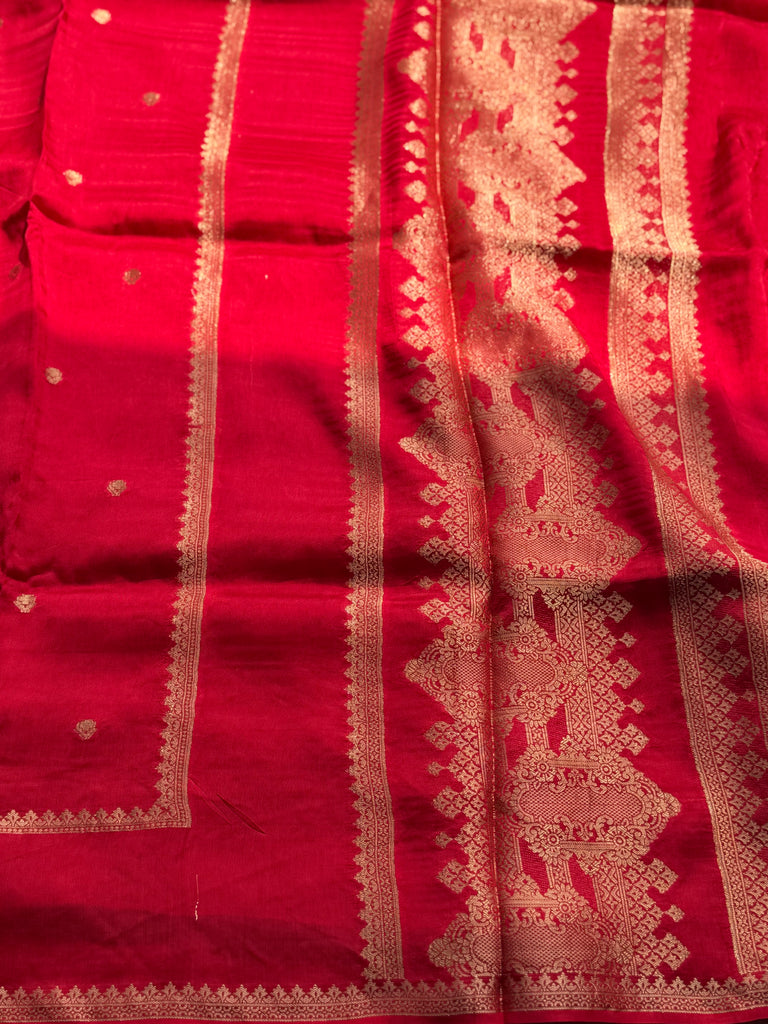 This red exquisite crepe silk saree radiates elegance with its smooth drape and vibrant sheen. The body is beautifully adorned with golden zari elephant buttas, adding a majestic touch to the rich fabric. Enhancing its traditional charm, the saree features retta pettu borders woven with classic motifs, creating a striking and timeless contrast.
