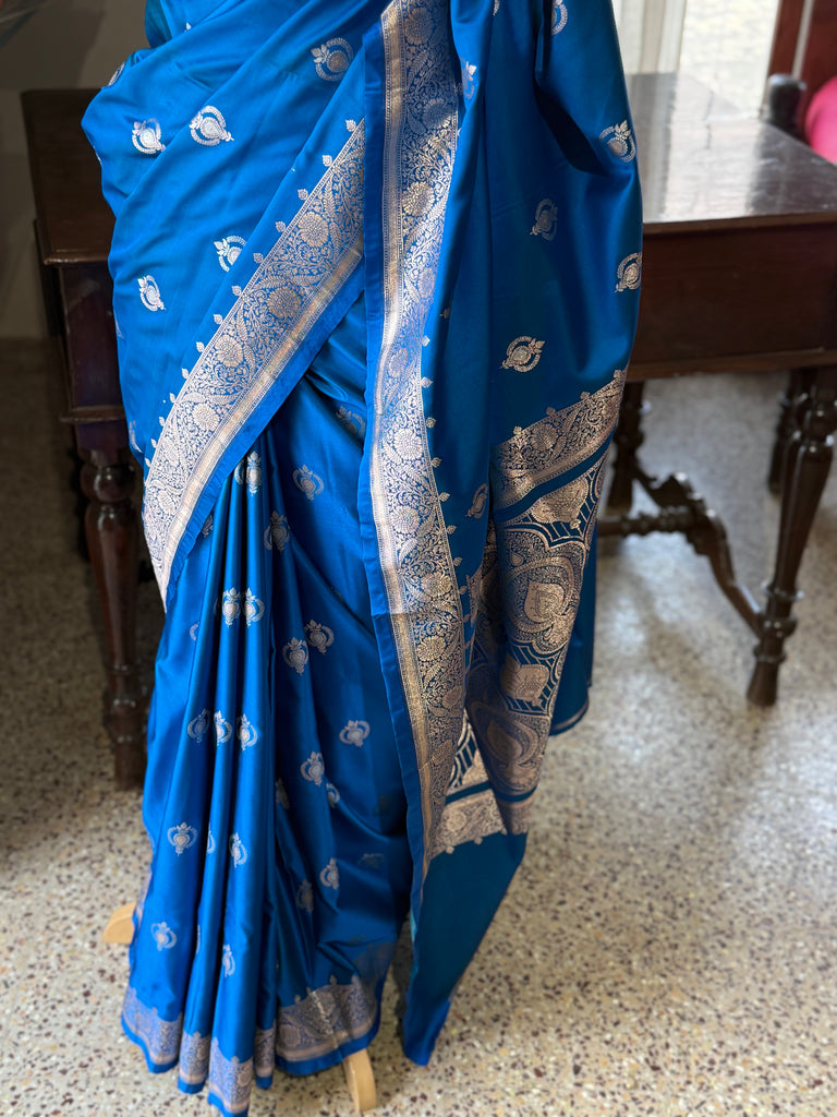 Step into the world of classic Indian elegance with this Pure Banarasi Katan Silk Saree in a vibrant Sky Blue, a stunning handloom creation from the looms of Varanasi. Designed to captivate, this saree combines classic colour with timeless motifs, making it a perfect choice for weddings, celebrations, and special occasions.