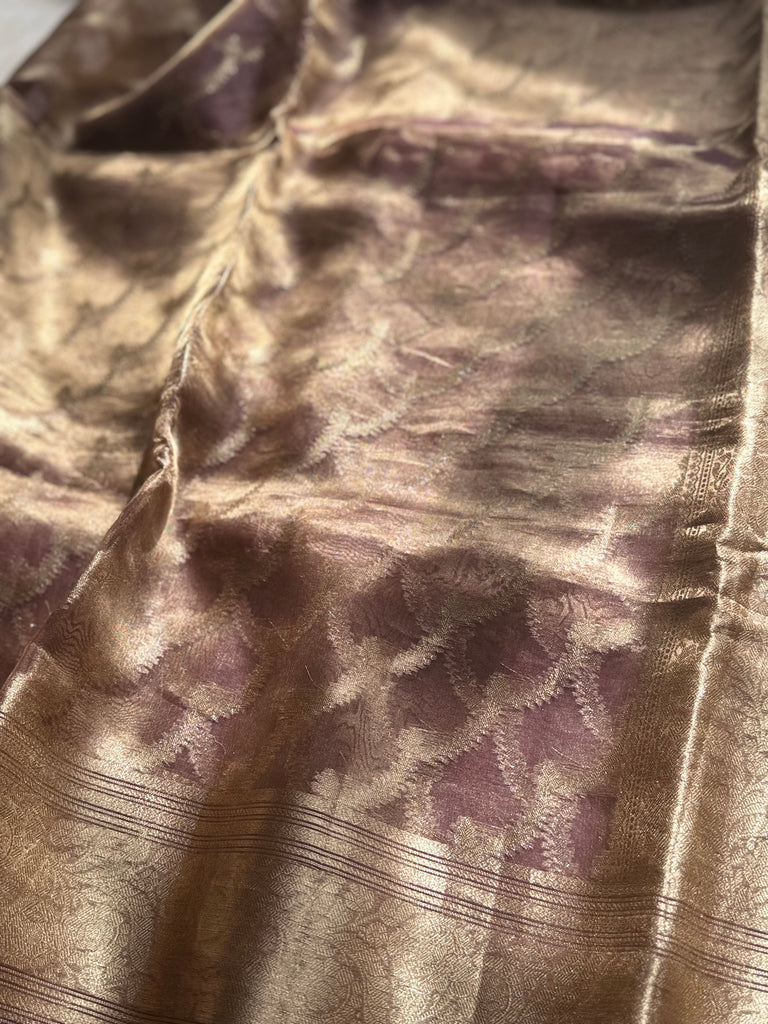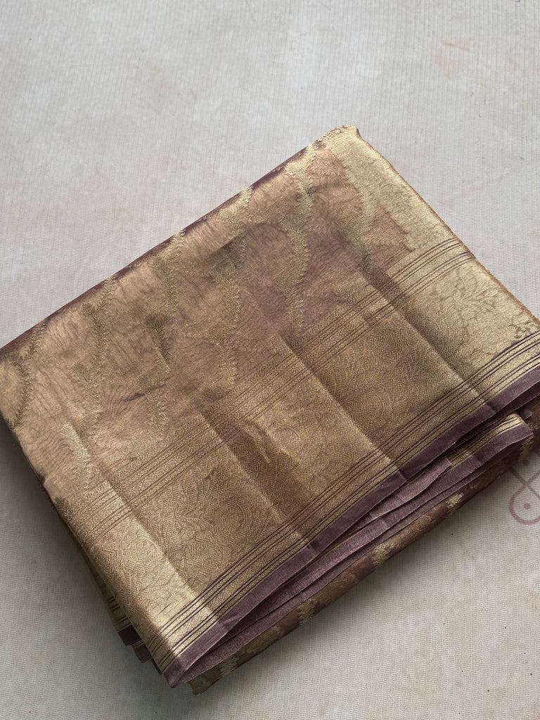 Embrace understated elegance with this pure tissue silk saree in mauve shade featuring a golden zari weave across the body. The design showcases a beautiful blend of traditional artistry with intricate gold zari detailing along the border. The muted sheen of tissue silk paired with the grandeur of gold zari gives this saree a regal charm, perfect for festive occasions, cultural celebrations, and traditional gatherings.