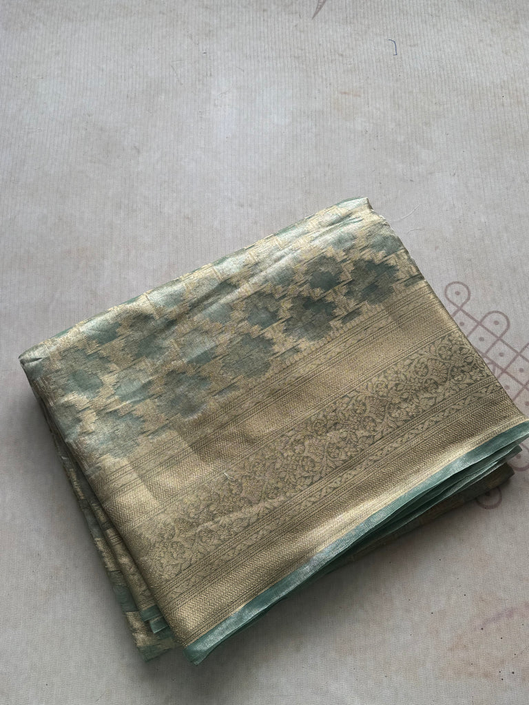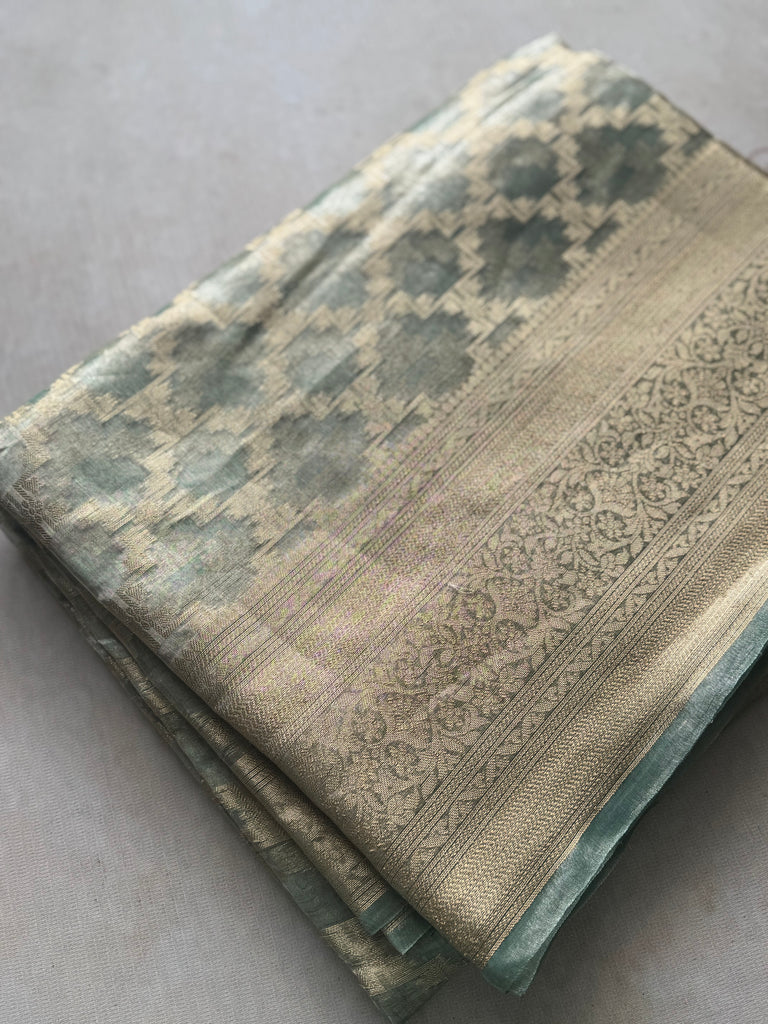 Embrace understated elegance with this pure tissue silk saree in green shade featuring a golden zari weave across the body. The design showcases a beautiful blend of traditional artistry with intricate gold zari detailing along the border. The muted sheen of tissue silk paired with the grandeur of gold zari gives this saree a regal charm, perfect for festive occasions, cultural celebrations, and traditional gatherings.