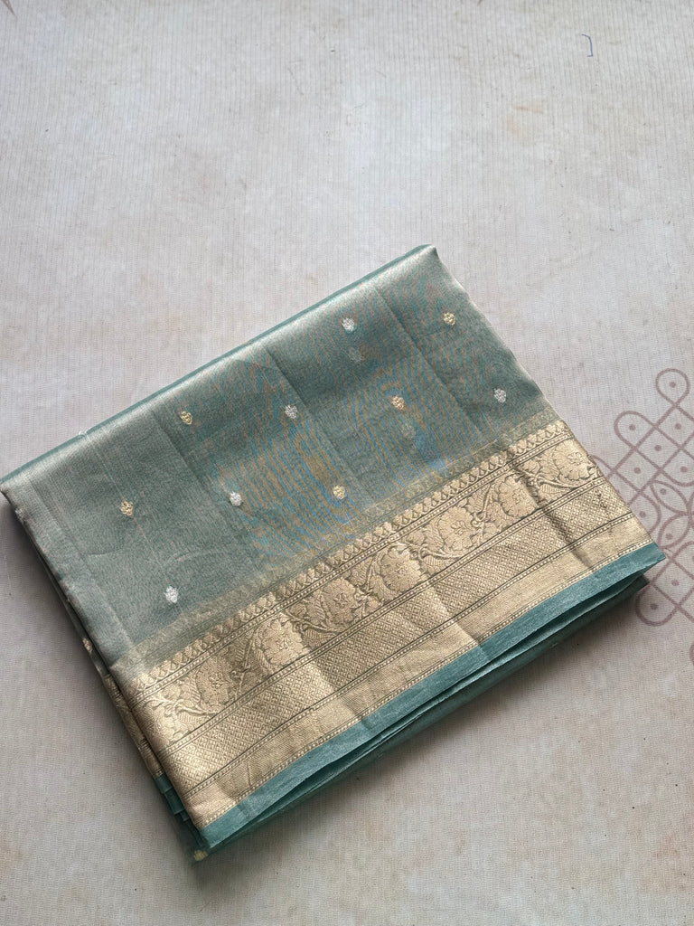Elevate your ethnic wardrobe with this elegant light sea green pure tissue silk saree featuring a refined golden zari border. The soft pastel hue is adorned with delicate gold and silver buttas, adding a subtle shimmer to the body. The intricately woven floral and geometric motifs on the border enhance its richness, making it perfect for festive occasions, weddings, and celebrations.