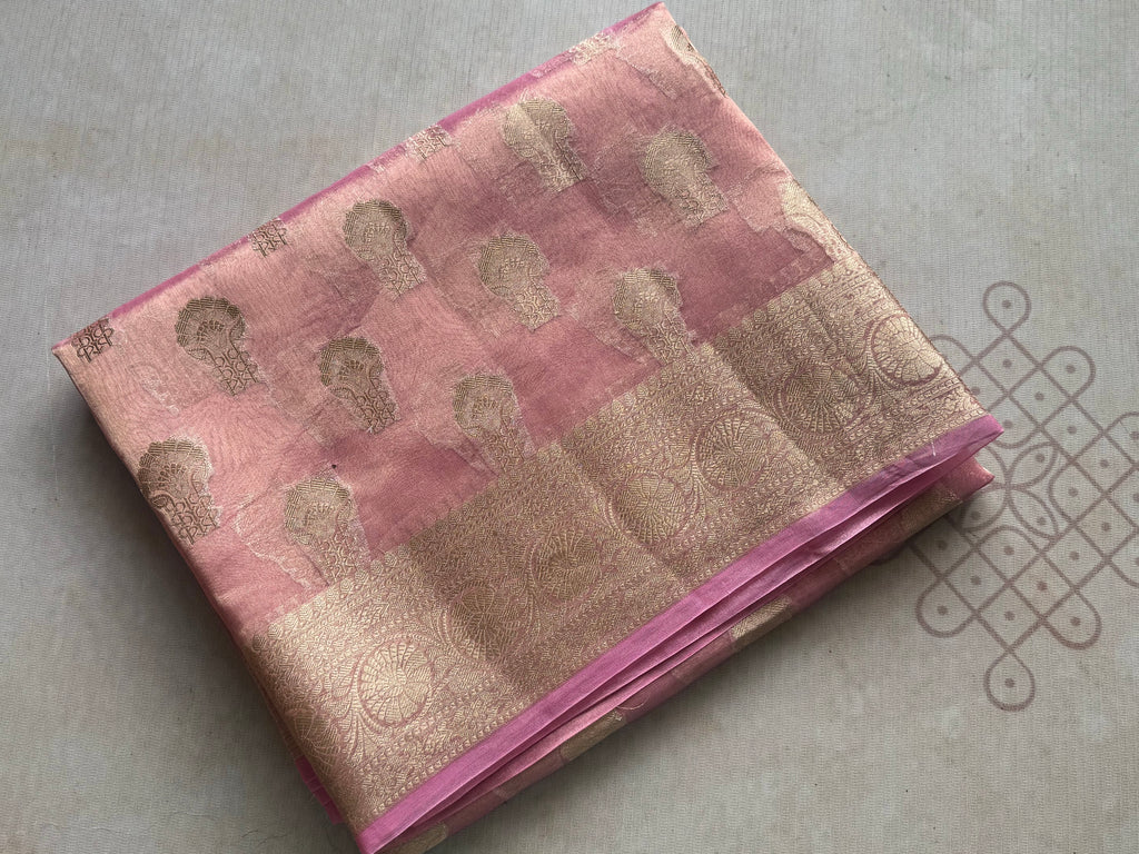 Elevate your ethnic wardrobe with this elegant pink shaded pure tissue silk saree featuring a refined golden zari border. The soft pastel hue is adorned with delicate gold zari buttas, adding a subtle shimmer to the body. The intricately woven floral and geometric motifs on the border enhance its richness, making it perfect for festive occasions, weddings, and celebrations.