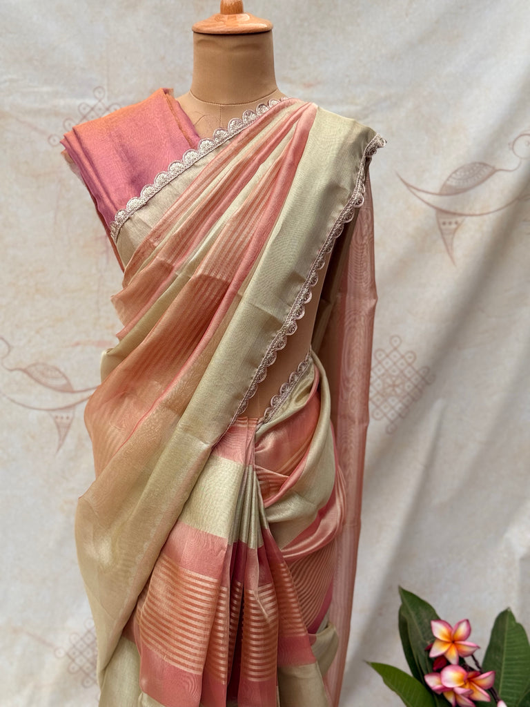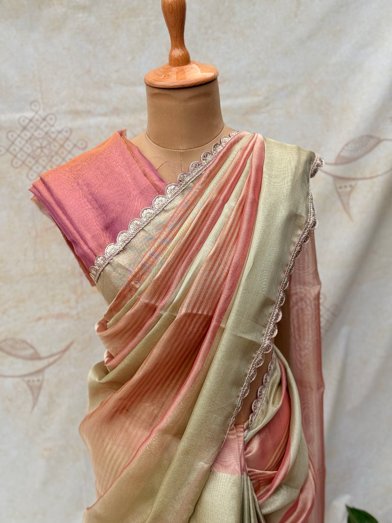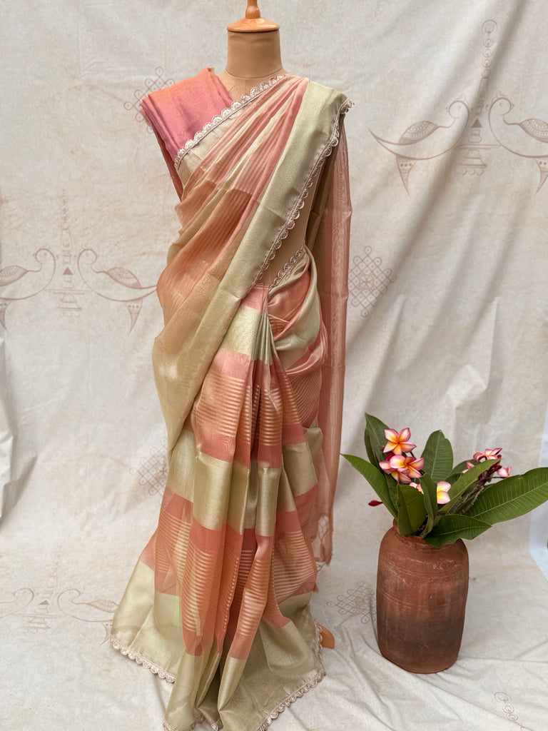 This elegant tissue saree is graced with delicate lace detailing along the border. The plain body, in a luxurious blend of gold and onion pink, radiates a bold yet graceful charm. Perfect for adding a touch of understated sophistication to any festive or special occasion.Wash Care – Dry Clean