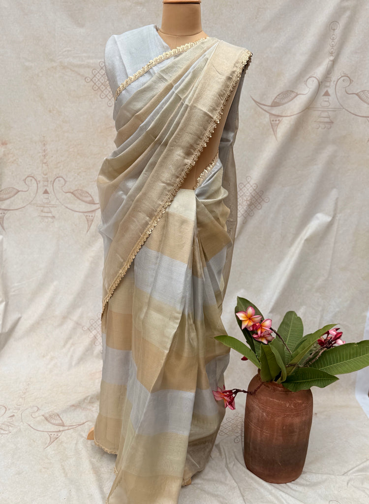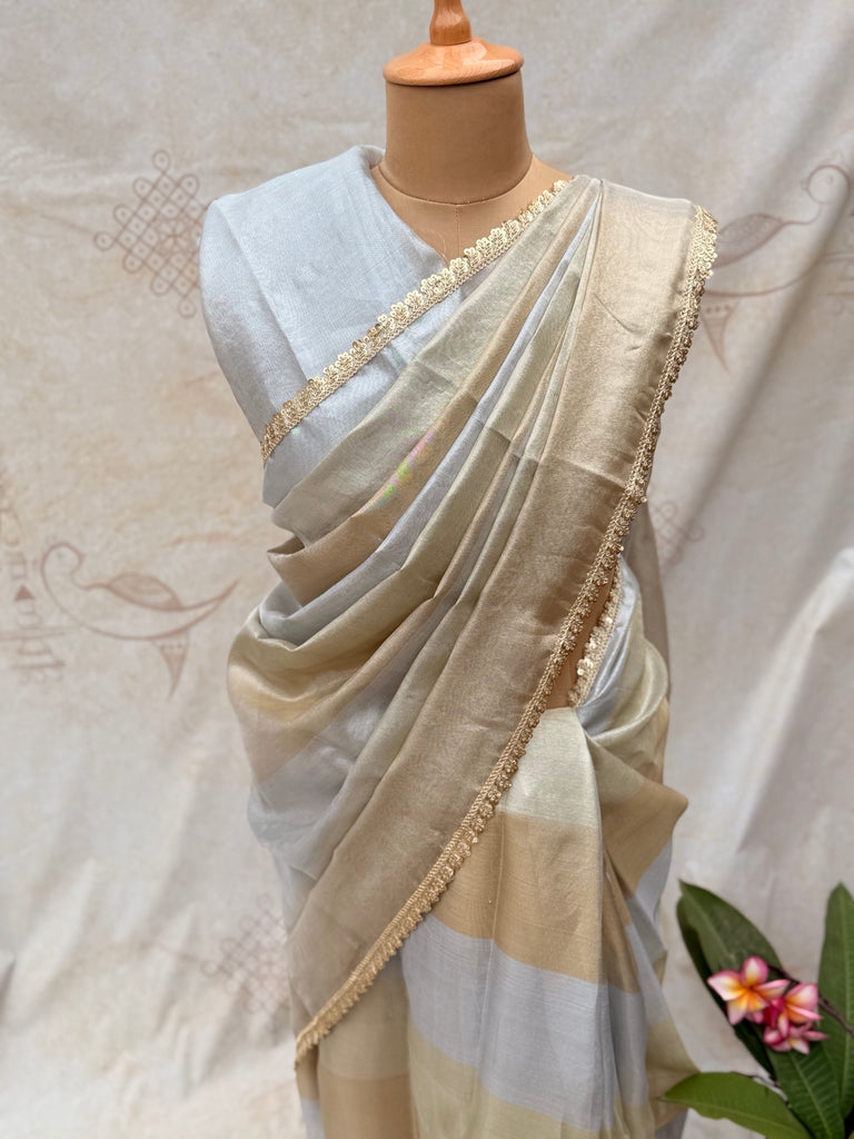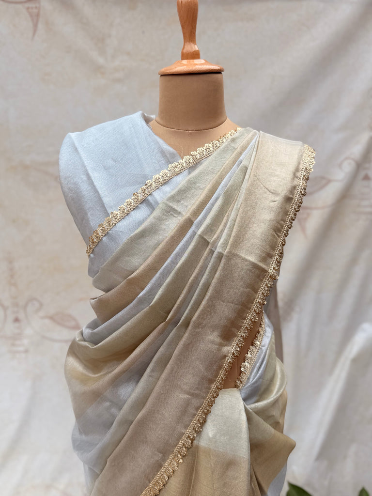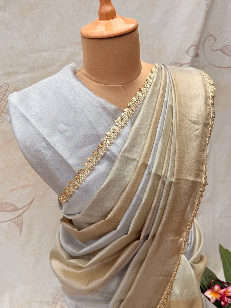 Radiating subtle opulence, this tissue saree is adorned with delicate lace detailing along the border. The plain body, in a stunning interplay of gold and silver hues, exudes a bold yet refined elegance. A perfect choice for occasions that call for understated glamour with timeless charm.