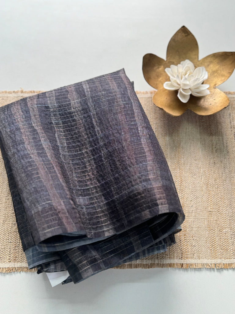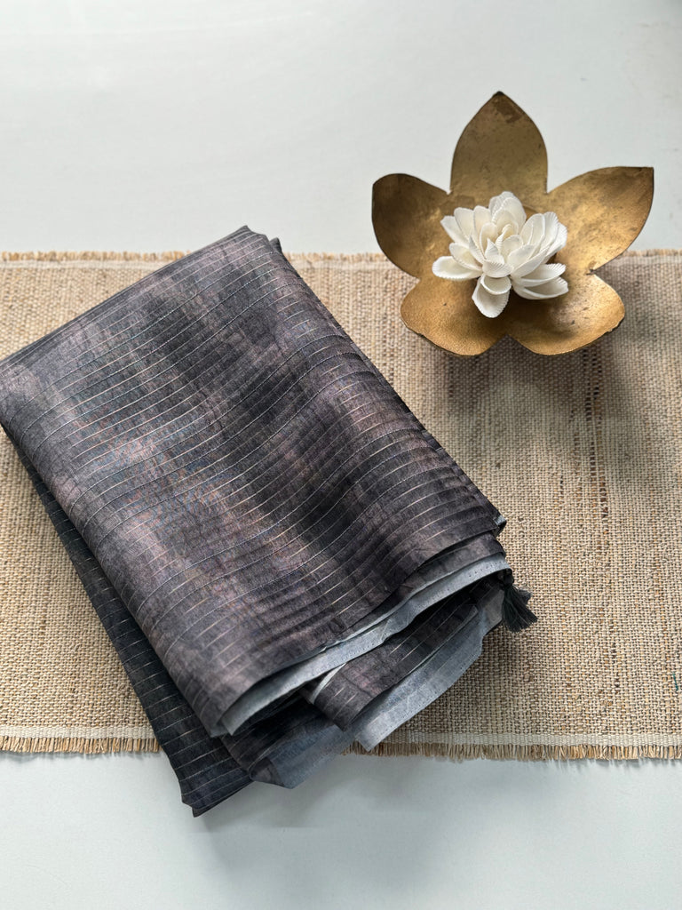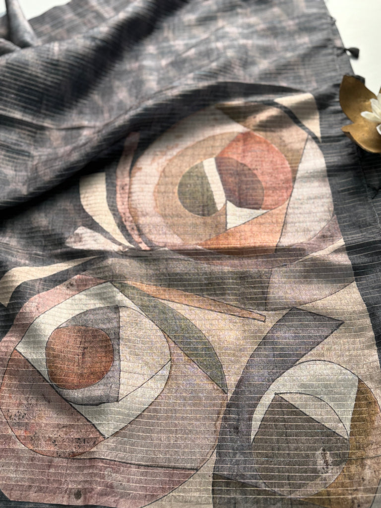 The trendy semi tussar in elephant grey woven with multicolour zari lines overall the saree and digital geometrical floral print in the shoulder and pallu .