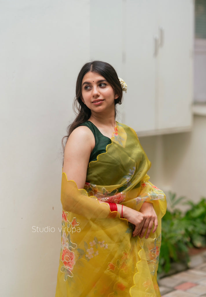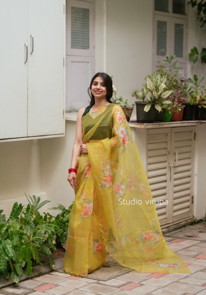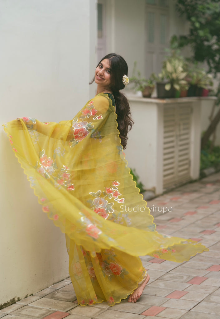 Senorita ..Elegantly designed Boutique collection ! Beautiful yellow organza with floral print overall the border and body with sequins detailings!