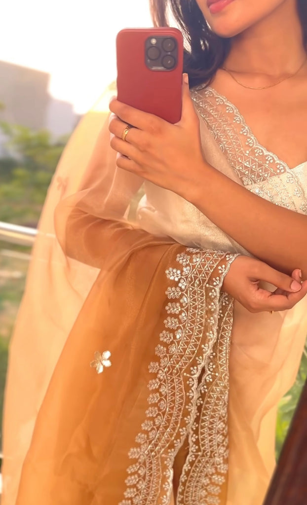 Senorita ..Elegantly designed Boutique collection ! Beautiful Golden Beige ombré organza with embroidery overall the scalloped border with sequins detailings!