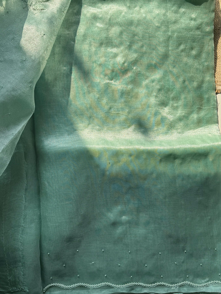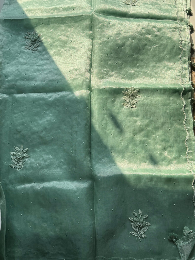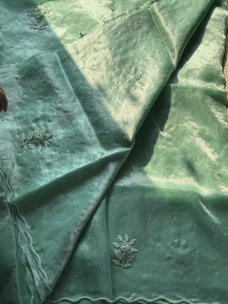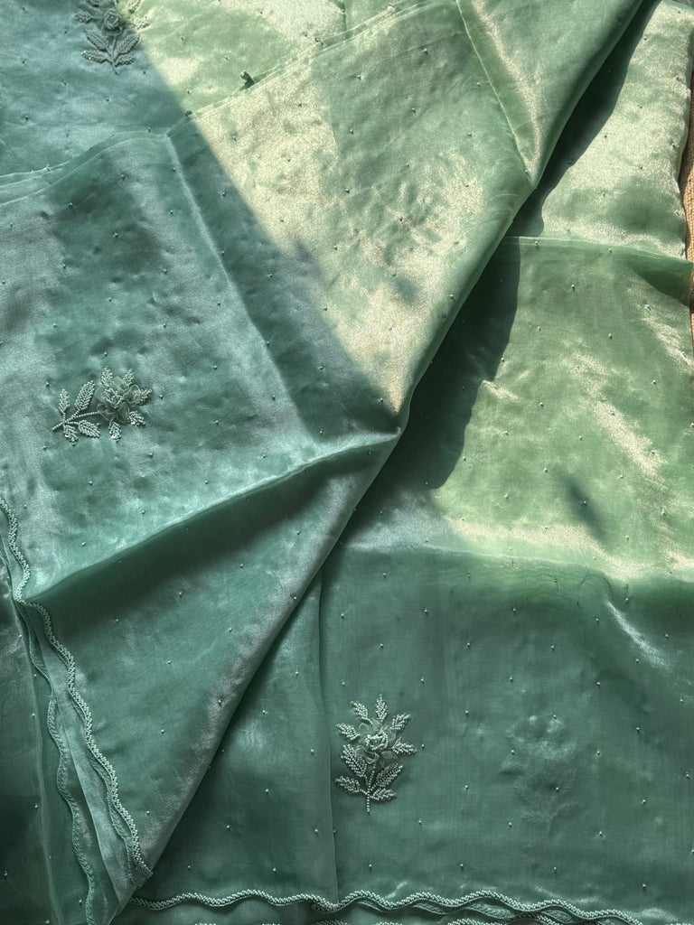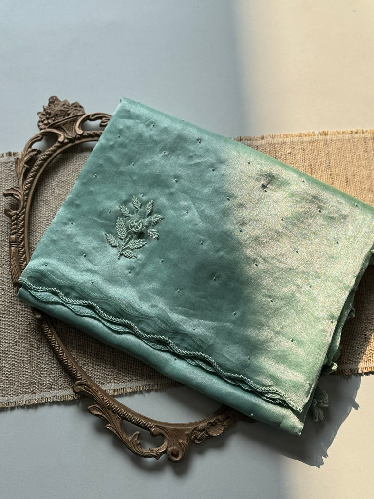 Senorita ..Elegantly designed Boutique collection ! Stunning green pure tissue saree with exclusive ribbon work hand embroidered overall the border and body!