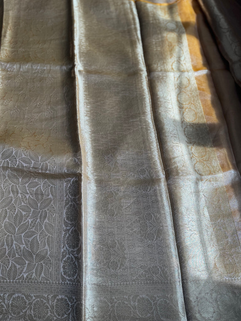 Drenched in the divine glow of Temple Gold, this Regal Banarasi Tissue Organza saree is a dazzling expression of heritage and elegance. Woven using traditional weft and warp techniques, the saree gleams with pure gold zari, creating a luminous, fluid texture that radiates sophistication. The body features delicate leaf motifs, adding subtle dimension to its golden brilliance.