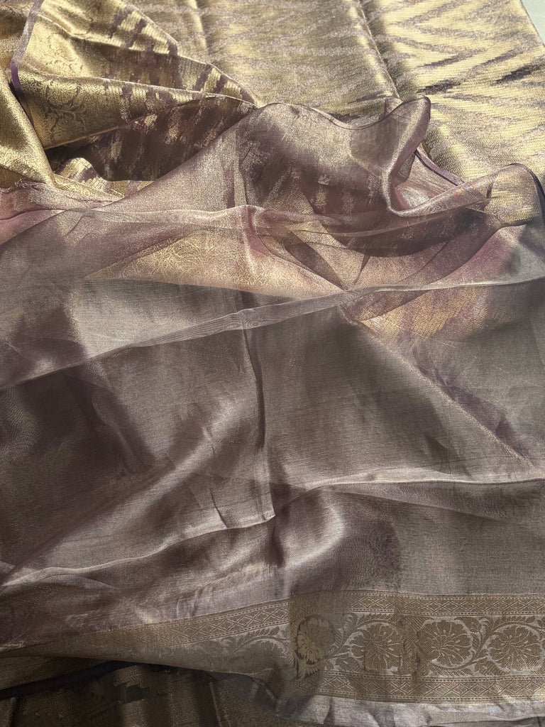 In a luminous amethyst hue, this Regal Banarasi Tissue Organza saree is a radiant blend of heritage craftsmanship and modern design. Expertly woven with weft and warp techniques, it shimmers with gold zari, bringing a soft glow to its elegant drape. The body features a striking vertical chevron pattern, adding contemporary structure to its ethereal silhouette.