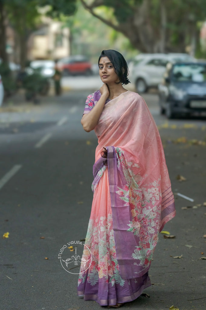 Exclusive Virupa range of semi linen boutique collection with Floral Print and zari border in lavender and orange shades.