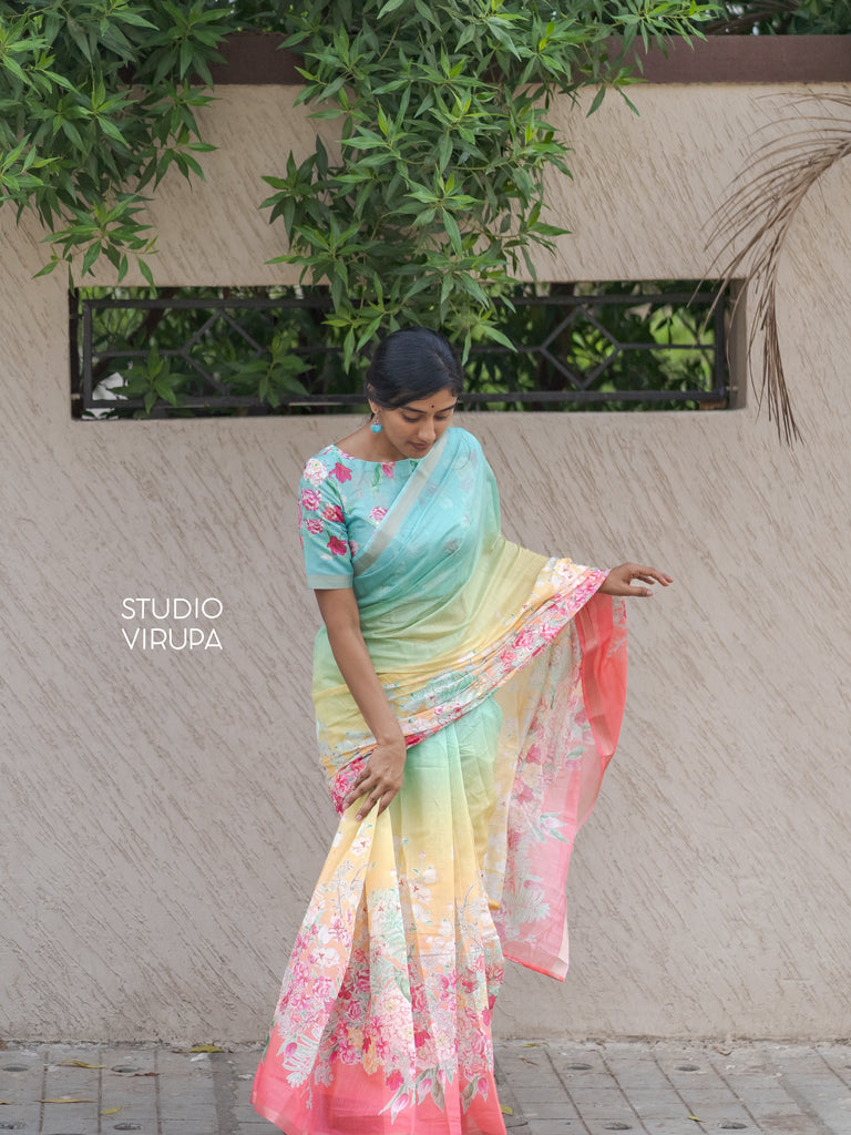 An exclusive Virupa range of semI linen boutique collection with Flora Print and zari border in blue,yellow and Peach shades.