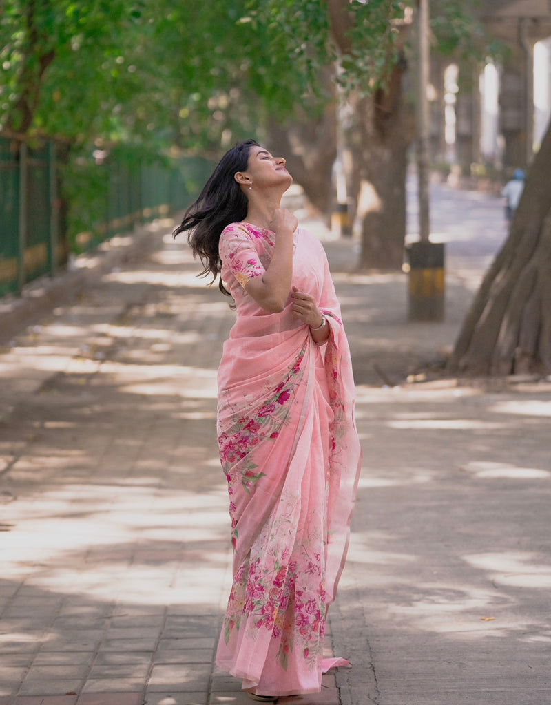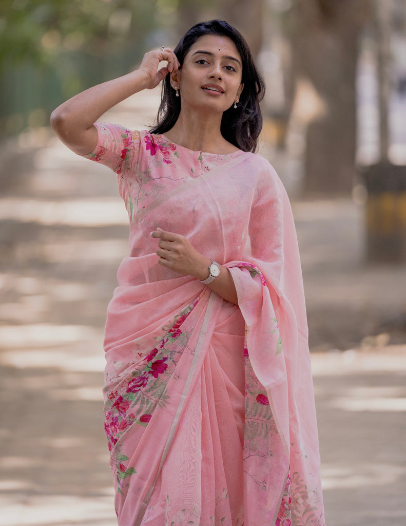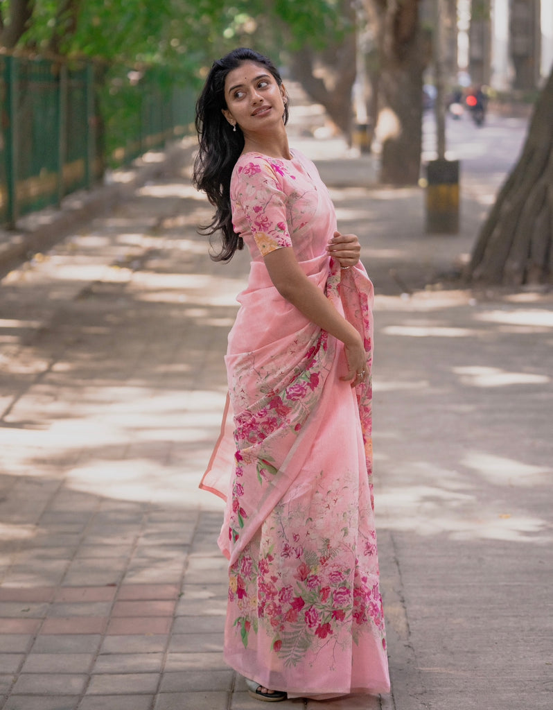 Exclusive Virupa range of semi linen boutique collection with Flora Print and zari border in very light pink shade.
