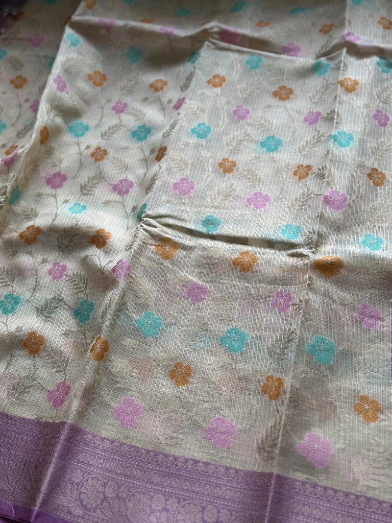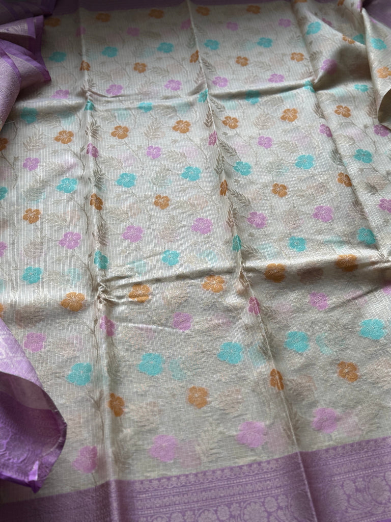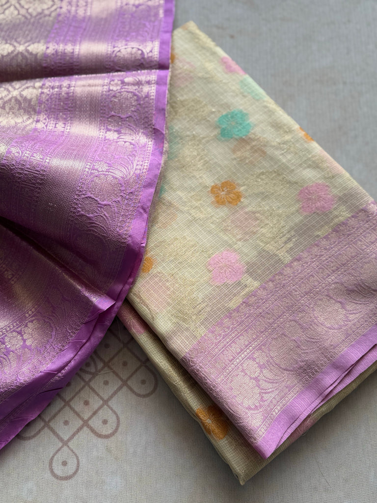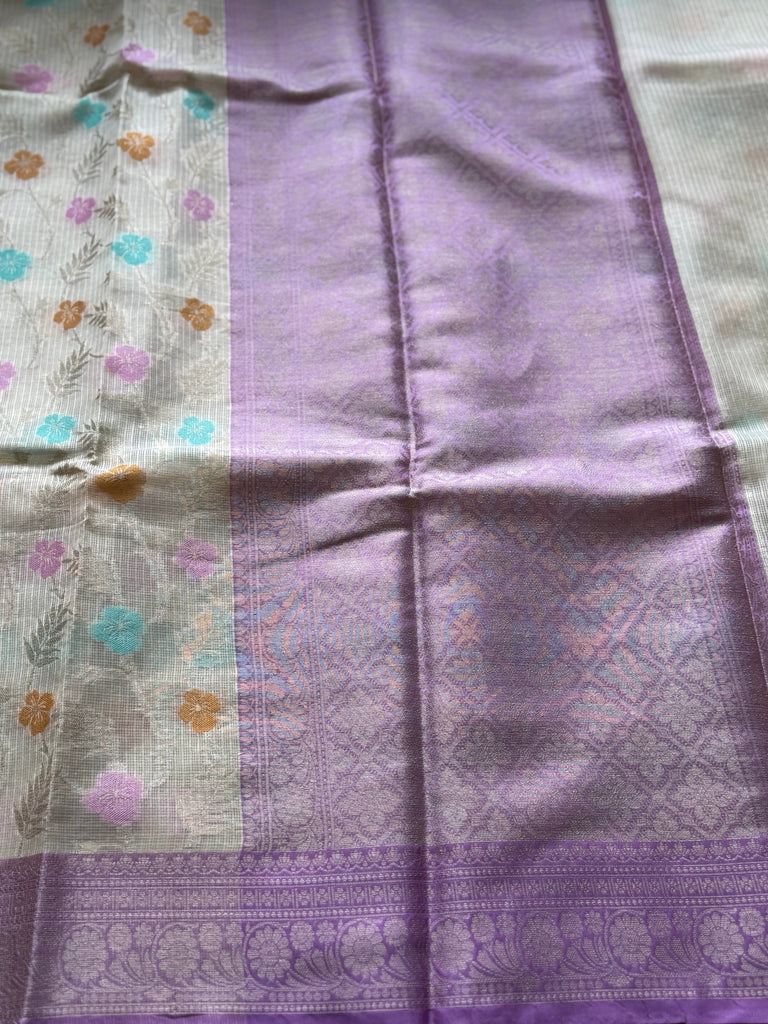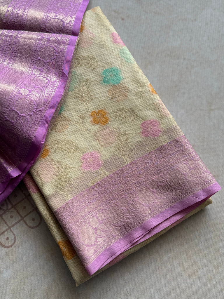 A striking lavender contrast border, adorned with zari work, frames the saree and lends a refreshing yet subtle elegance. The ensemble is completed with a matching lavender blouse, designed with coordinating zari detailing for a graceful finish.