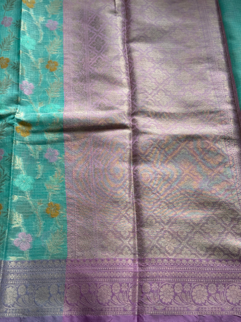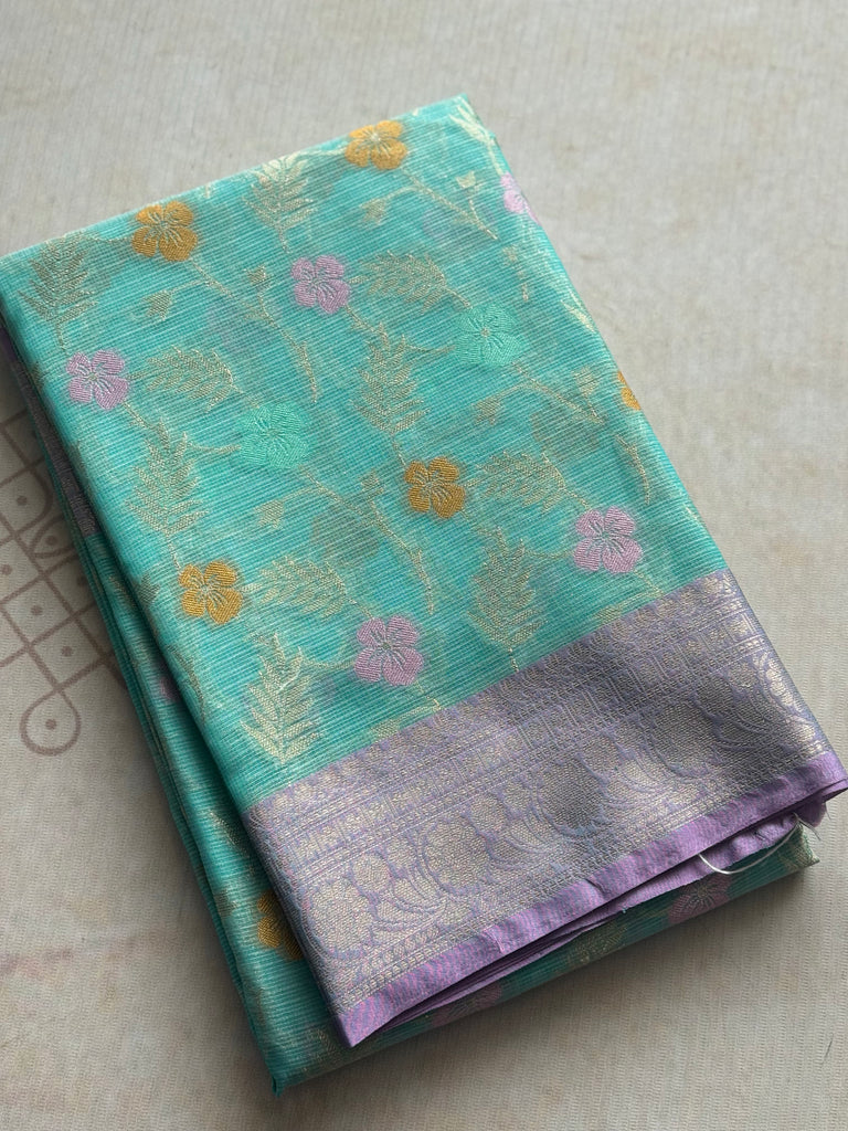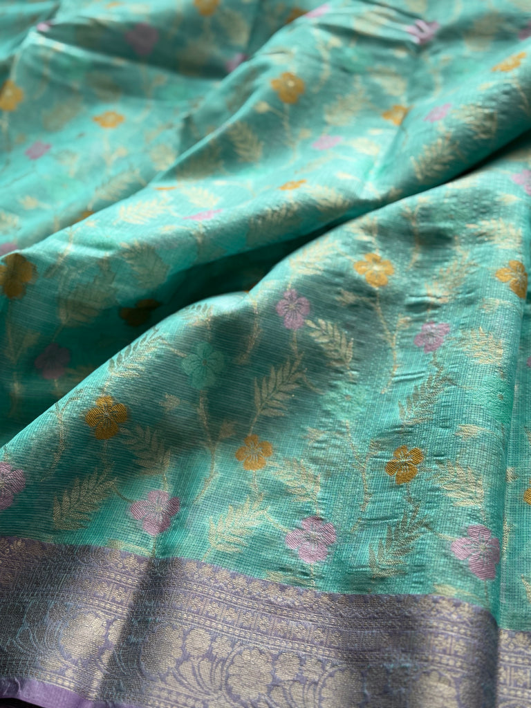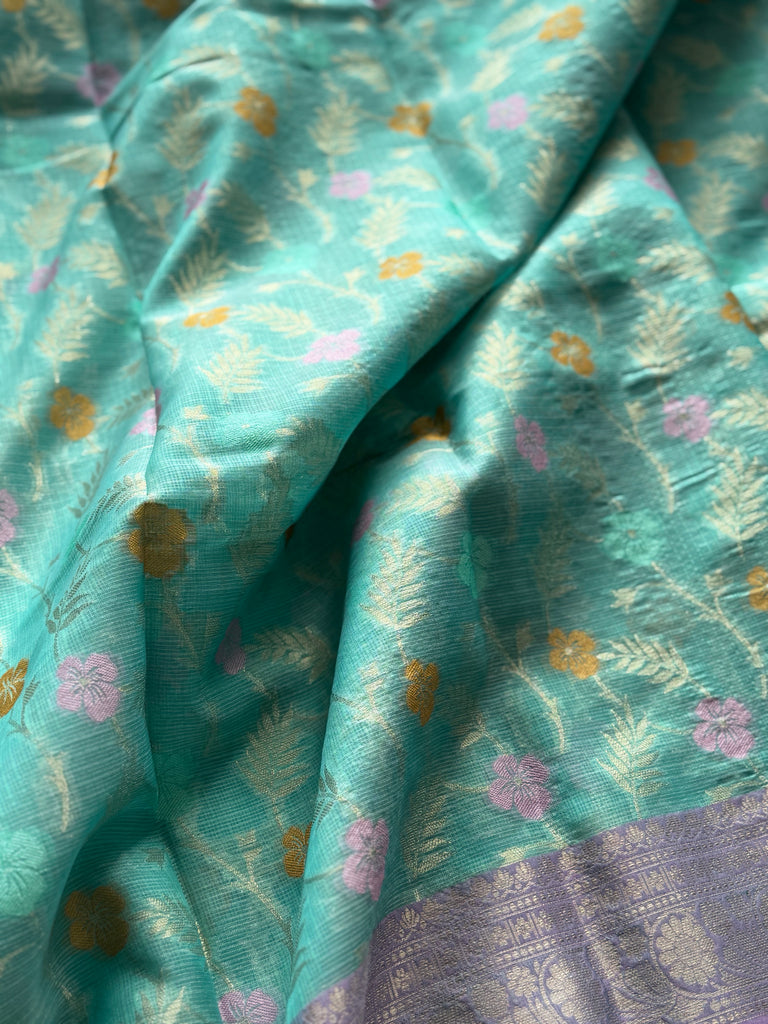 Turn heads in subtle sophistication with this exquisite Banarasi Zari Kota Saree, beautifully woven in a soft pastel aquamarine hue. Designed with an all-over golden zari jaal pattern accented by delicate meenakari details, the saree blends classic craftsmanship with a refreshing modern palette.