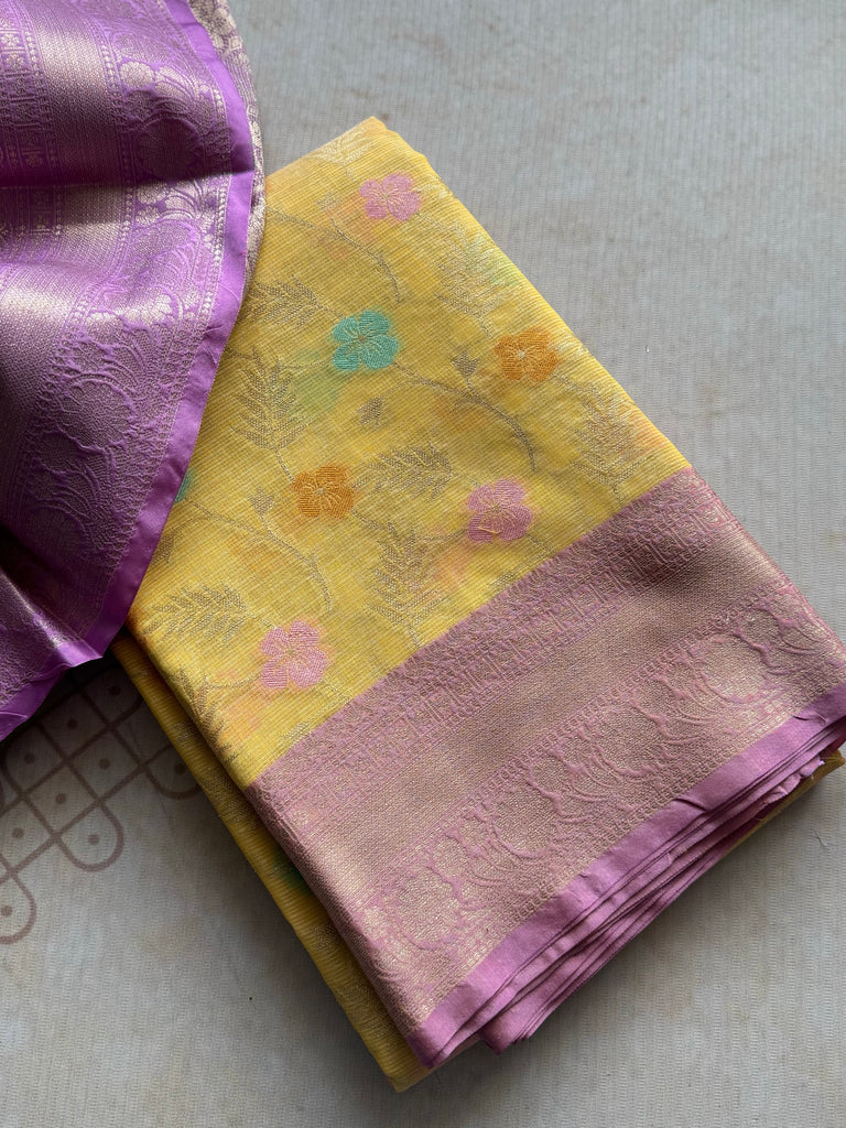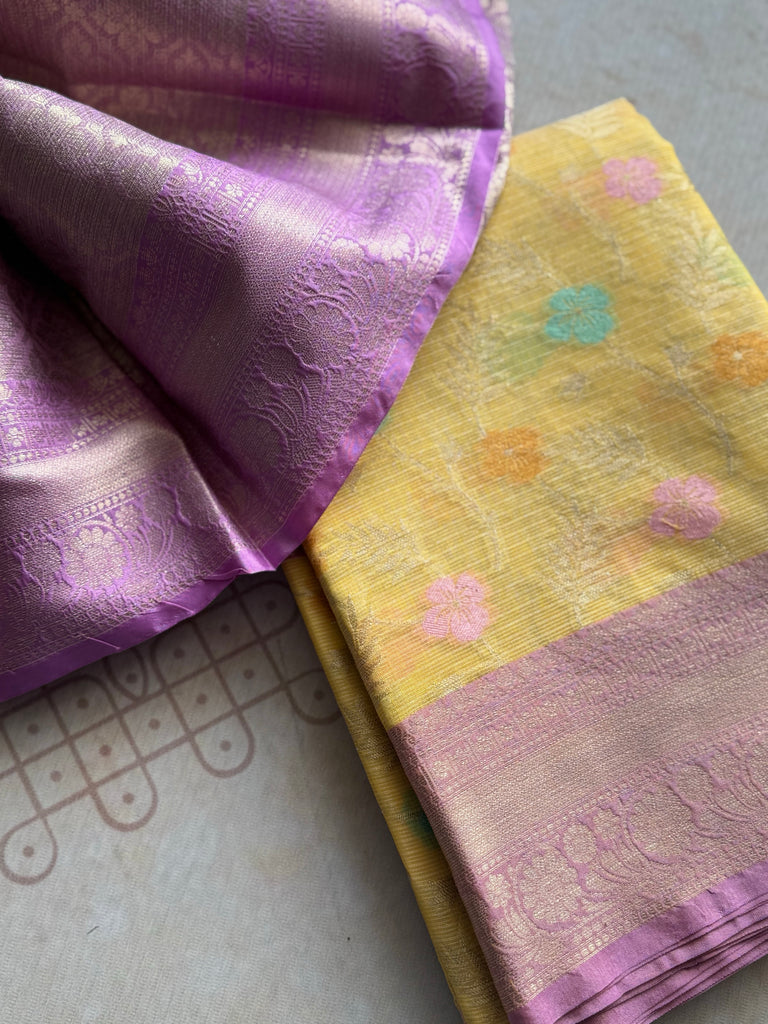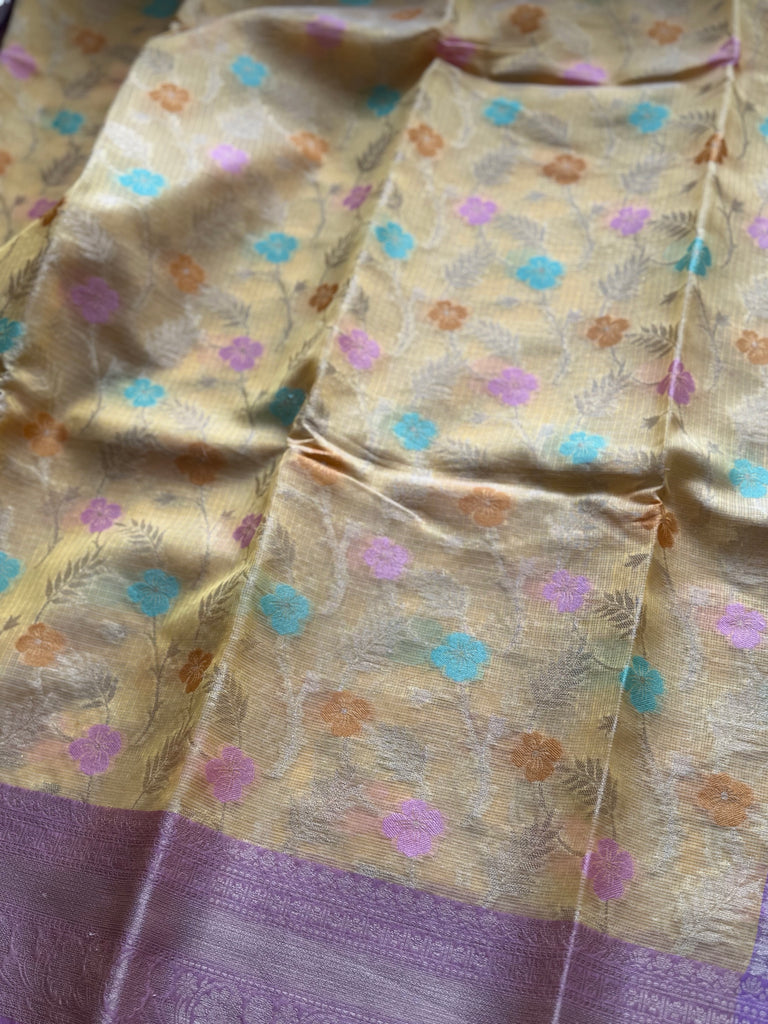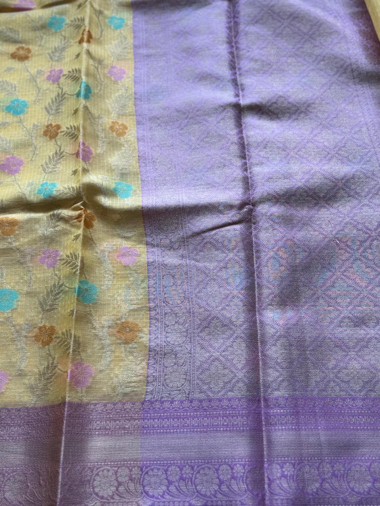 Delicate yet distinctive, this Banarasi Zari Kota saree in a soft pastel yellow shade is a graceful expression of timeless elegance. The body is beautifully adorned with an intricate jaal pattern, woven in golden zari and enhanced with subtle meenakari detailing, showcasing the richness of Banarasi craftsmanship in a light, breathable fabric — perfect for both festive and daytime occasions.