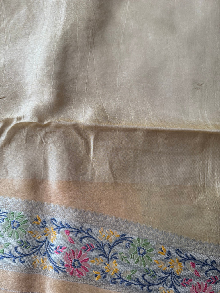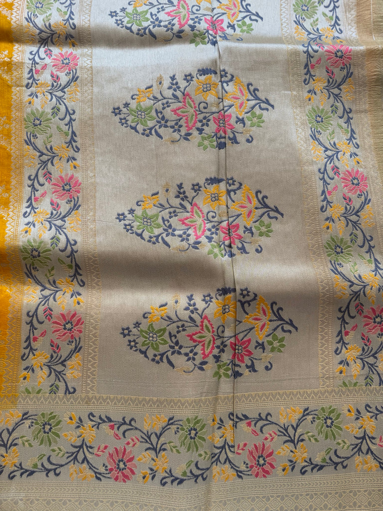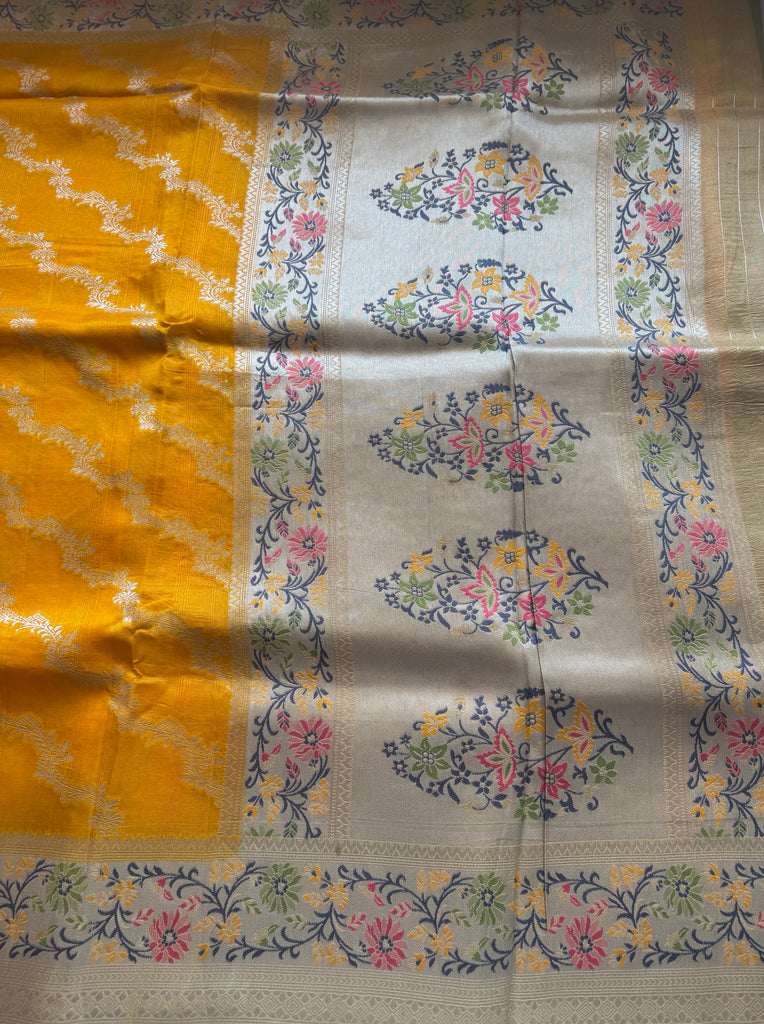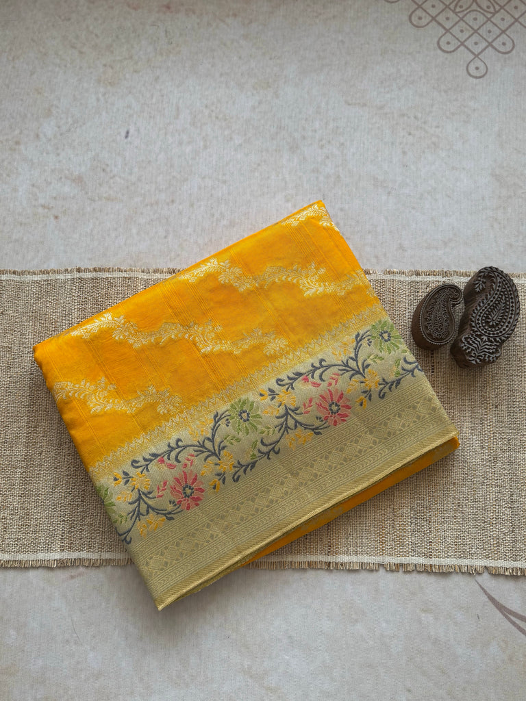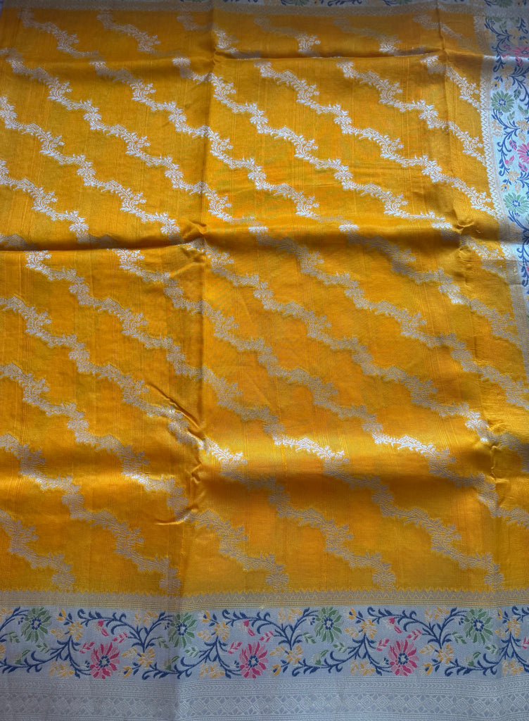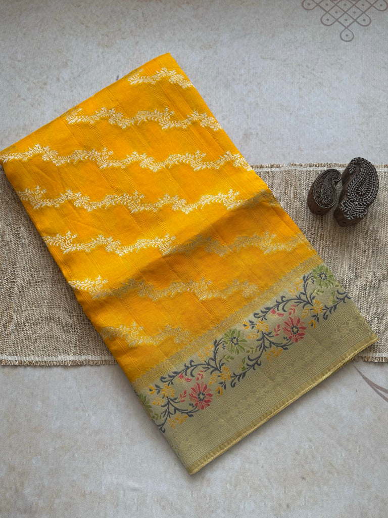 Step into effortless elegance with this beautiful Turmeric Yellow Matka Tussar Banarasi Saree. The body is adorned with an intricate silver zari jaal pattern, creating a subtle yet luxurious texture. The saree features a finely crafted beige border, embellished with traditional meenakari and zari work, adding depth and heritage charm. A stitched selvedgeensures durability and a neat finish. The saree comes with a matching blouse piece, highlighted by a beige meenakari border on the sleeves for a coordinated and refined look.
