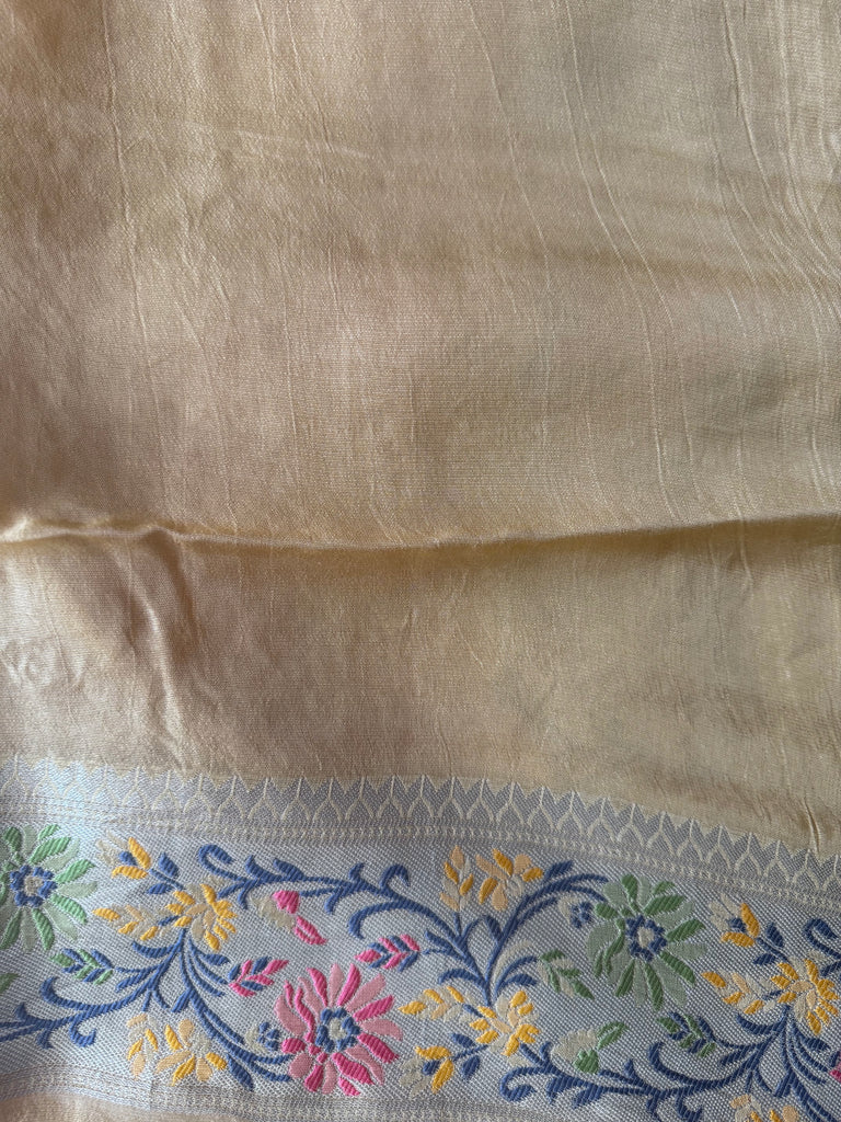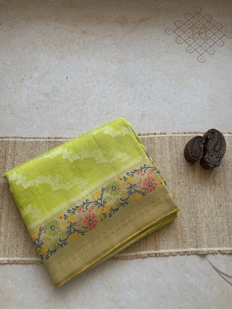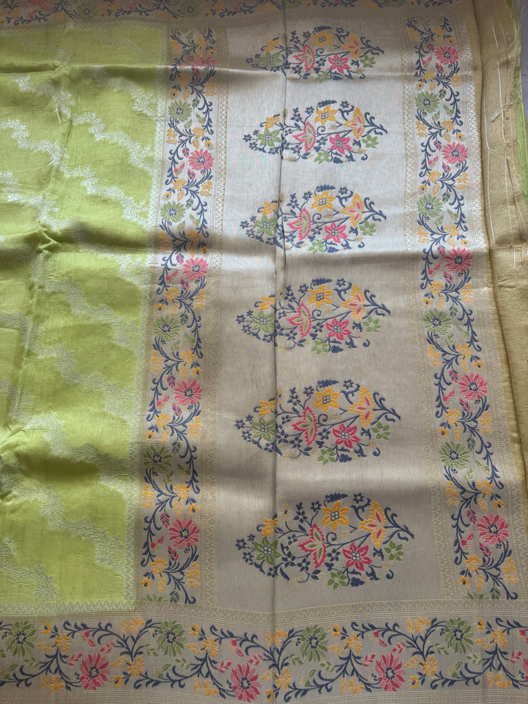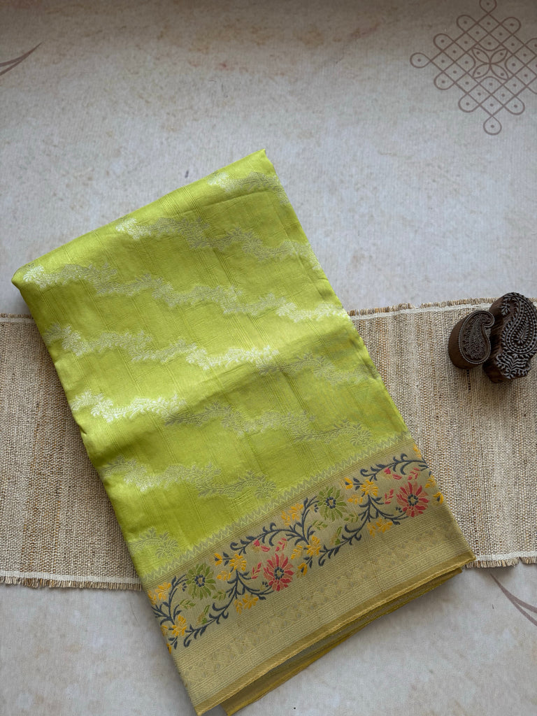 Elevate your ethnic wardrobe with this captivating Pear Green Matka Tussar Banarasi Saree. The saree features an all-over silver zari jaal pattern that adds a graceful sheen to the soft, lustrous body. A contrasting beige border, enriched with exquisite meenakari detailing and fine zari work, lends an aura of timeless sophistication. The addition of a stitched selvedge enhances durability while giving a clean, refined edge. This saree is paired with a coordinated blouse piece, designed with a matching beige color with meenakari border on the sleeves, ensuring a cohesive and elegant look for any special occasion.