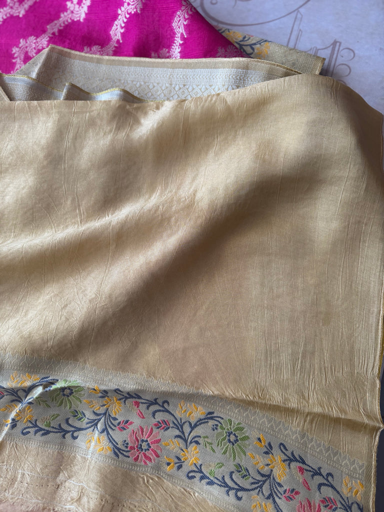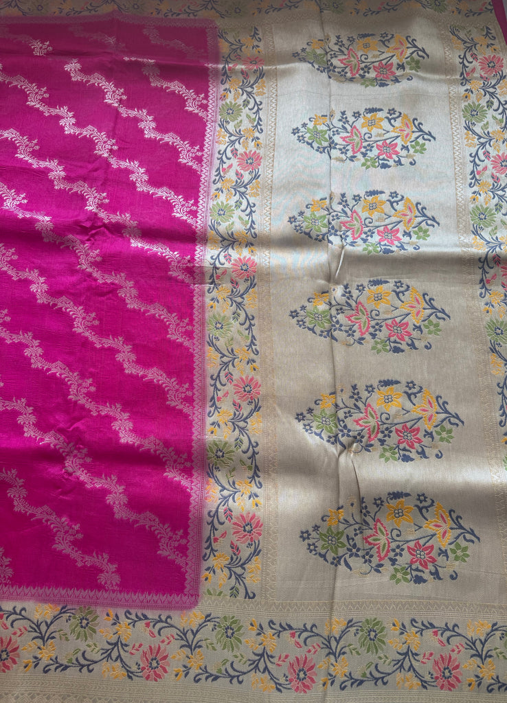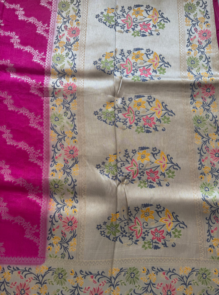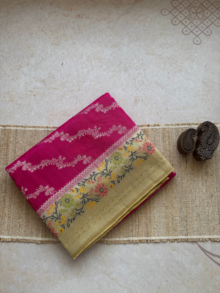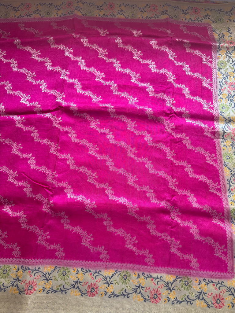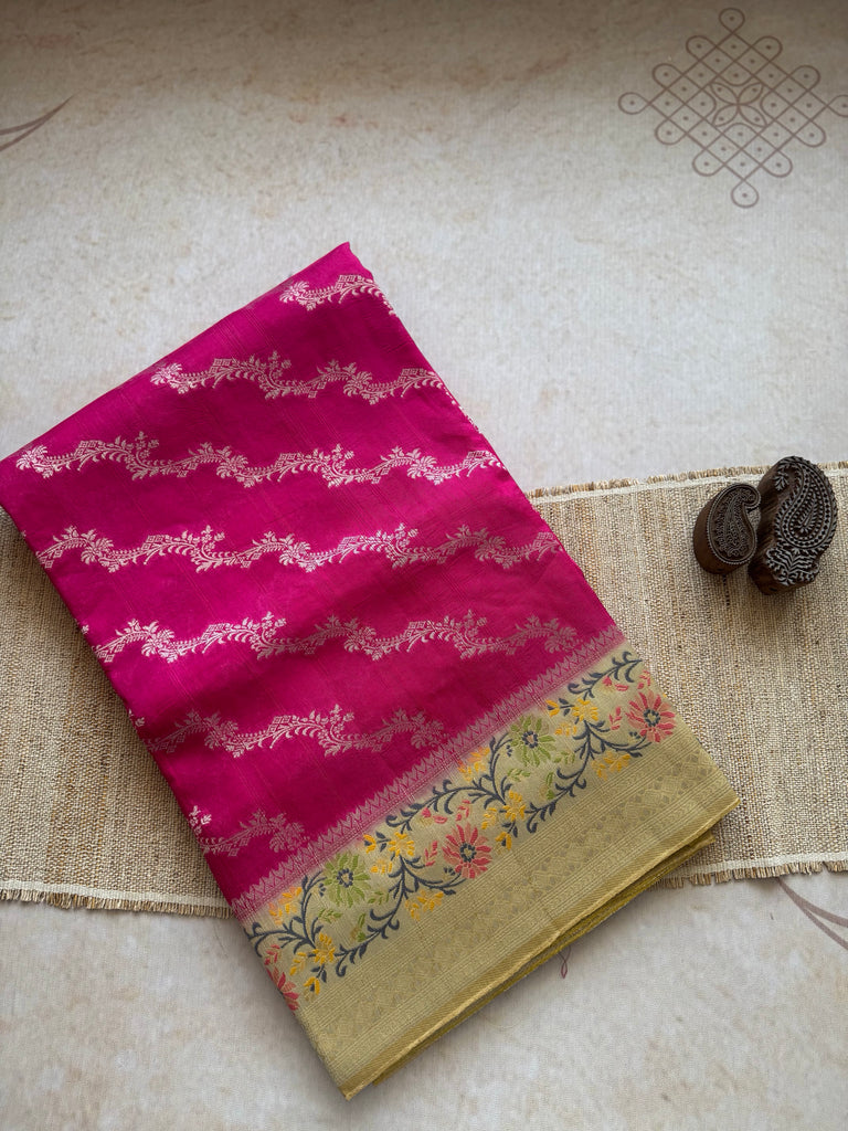 Step into a world of refined elegance with this enchanting Cactus Fruit Pink Matka Tussar Banarasi Saree. The body is gracefully woven with a delicate silver zari jaal pattern, offering a subtle shimmer against the vibrant pink hue inspired by cactus fruit. A beautifully crafted beige border, adorned with intricate meenakari and zari work, brings in traditional richness and contrast. The saree is finished with a stitched selvedge, ensuring both durability and a polished look. It comes with a coordinated blouse piece, featuring a beige meenakari border on the sleeves for a harmonious and sophisticated finish.