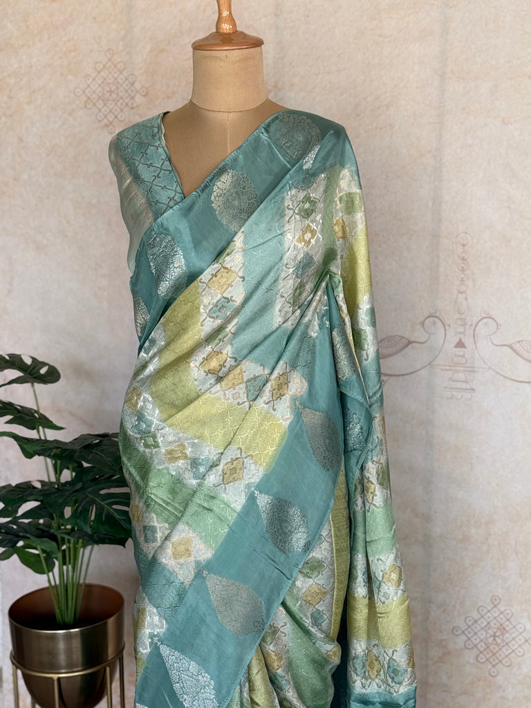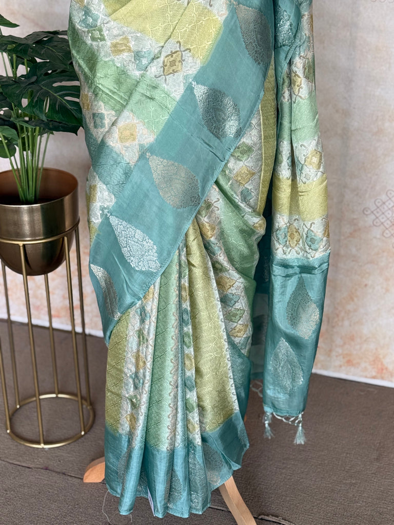 Graceful and contemporary, this soft satin silk saree is designed for effortless elegance. Crafted in a soothing blend of teal, sea green, and muted olive tones, the saree features a refined rangkat-style detailing that creates a fluid colour transition across the body, enhancing its modern appeal.