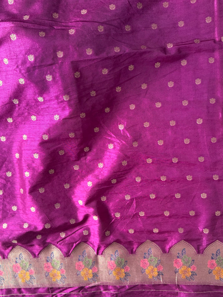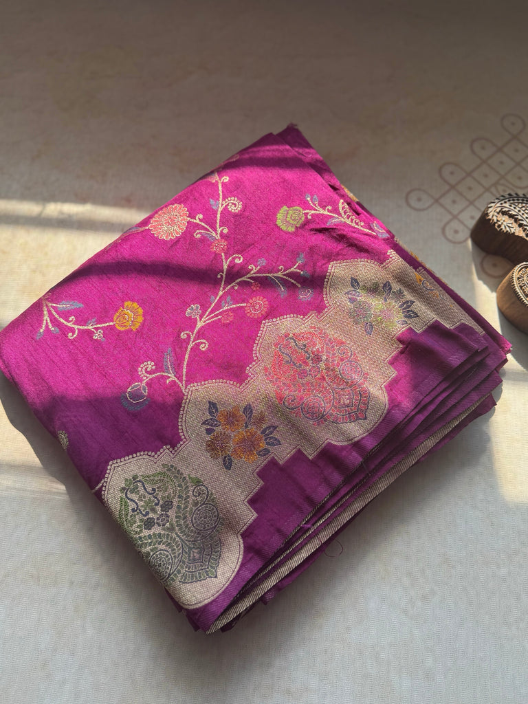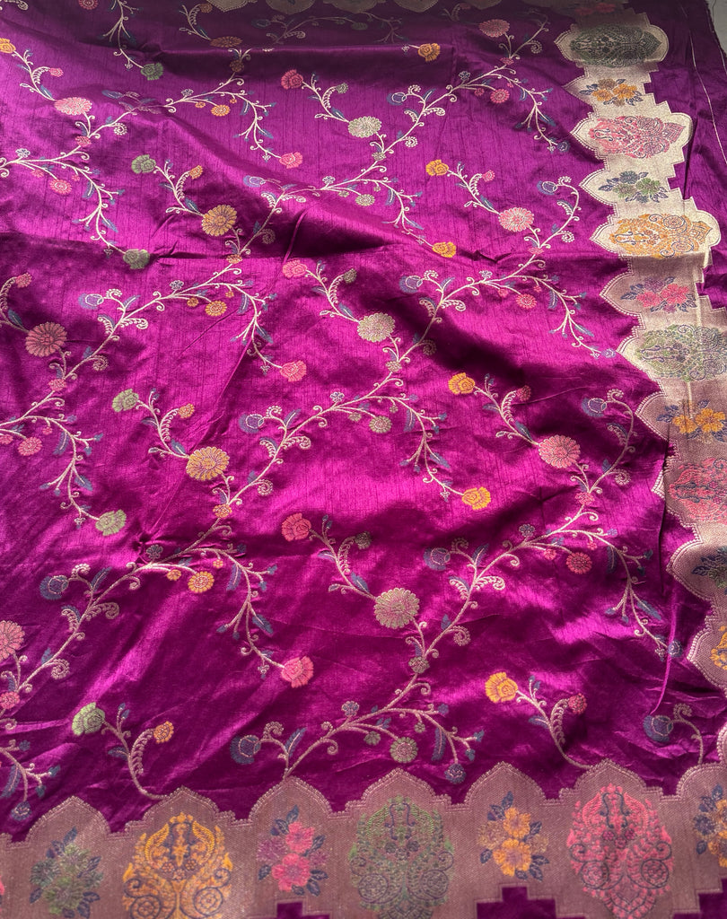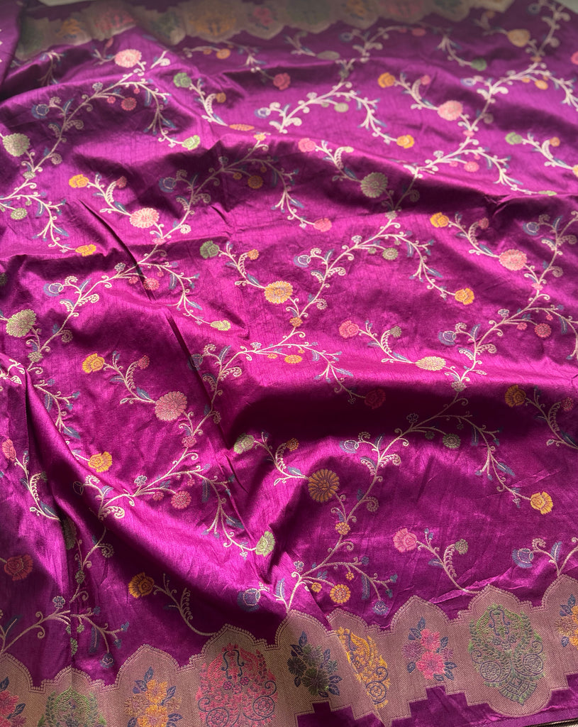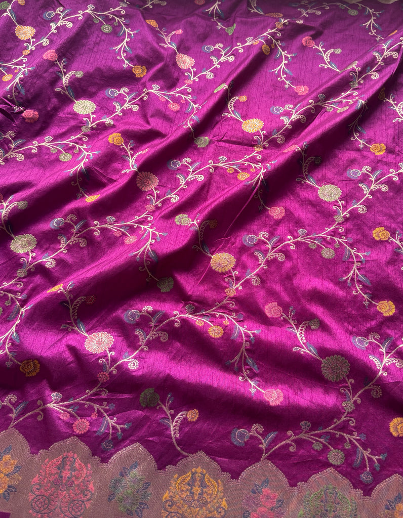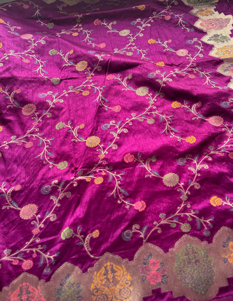 The saree features an all-over jaal pattern, meticulously woven with zari and Meenakari work, offering a stunning blend of tradition and artistry. A beautiful zari border highlighted with Meenakari detailing adds a regal touch, while the pallu mirrors the border, completing the look with fluid elegance. The matching blouse is designed with delicate zari motifs and zari-bordered sleeves, bringing balance and refinement to the ensemble.