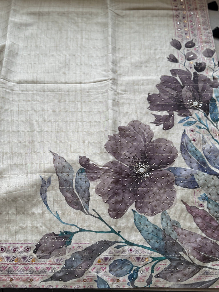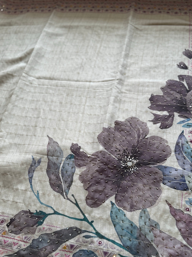 Elevate your style with this elegant tussar saree, beautifully blended with floral digital prints that bring a fresh, contemporary charm to traditional drapes. The soft texture of tussar silk offers a graceful fall and natural sheen, making it perfect for both daytime and evening occasions.
