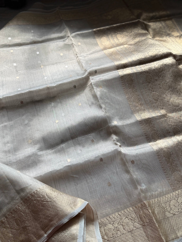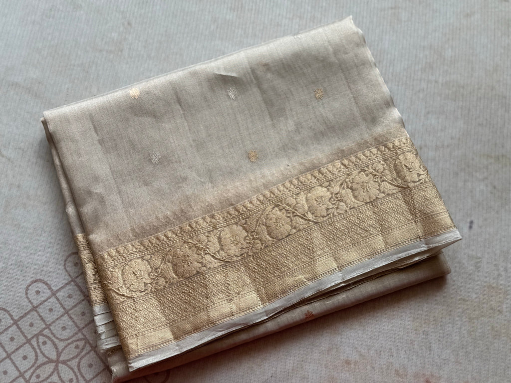 Elegant and timeless, this Banarasi tissue saree in a rich tussar gold tone is beautifully adorned with delicate Sona Rupa buttas throughout the body, adding a graceful shimmer and classic charm. The golden zari border features intricate jaal patterns, while the pallu mirrors this richness with stunning gold zari jaal detailing that elevates the entire look.