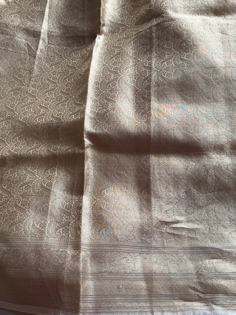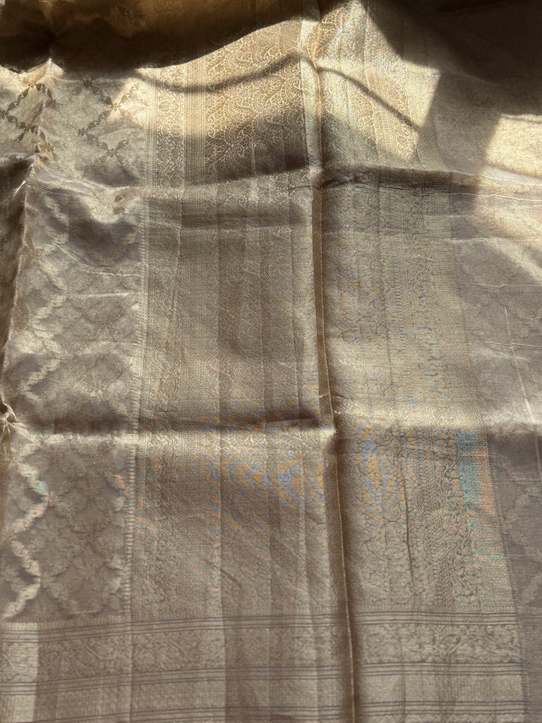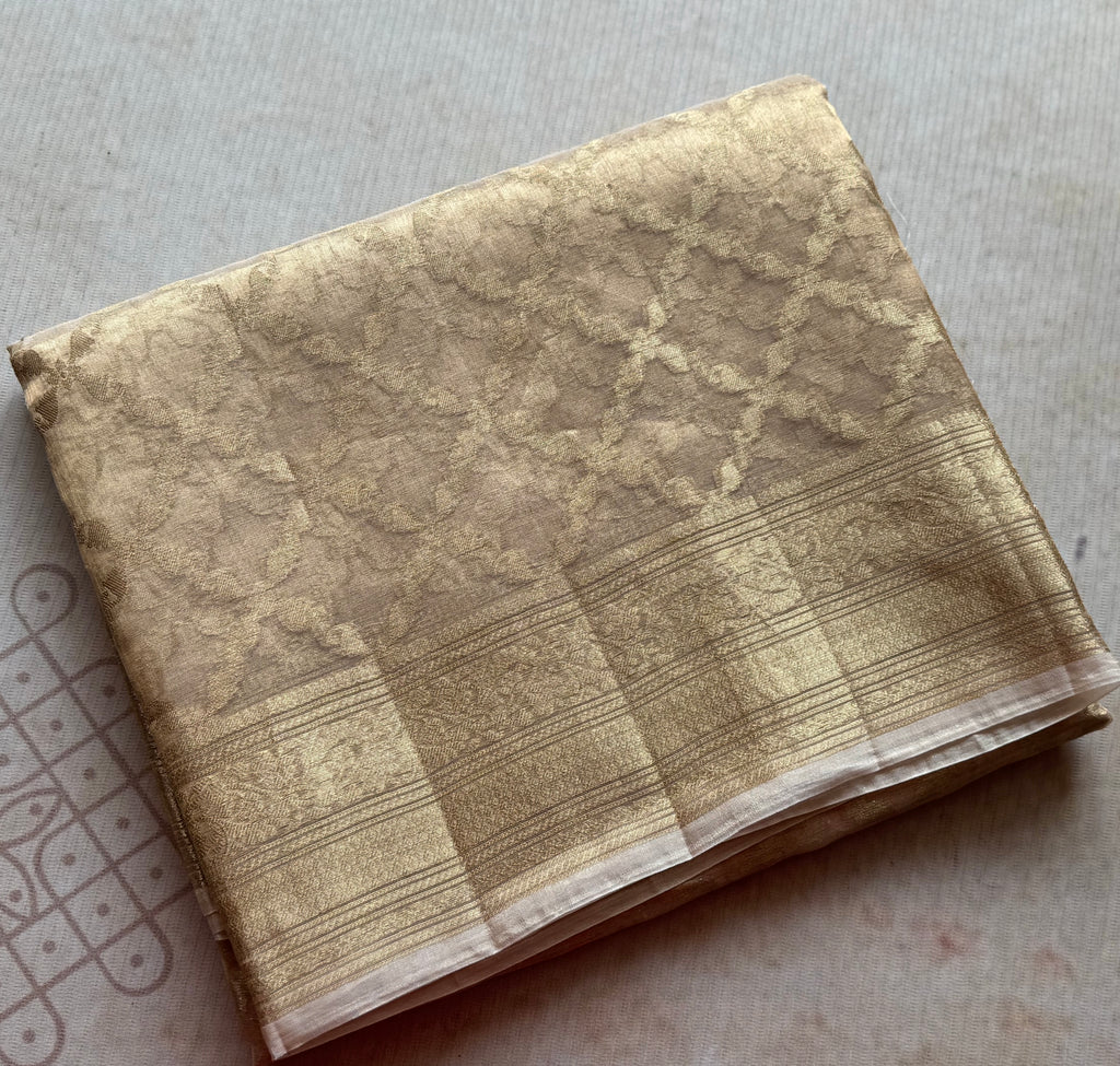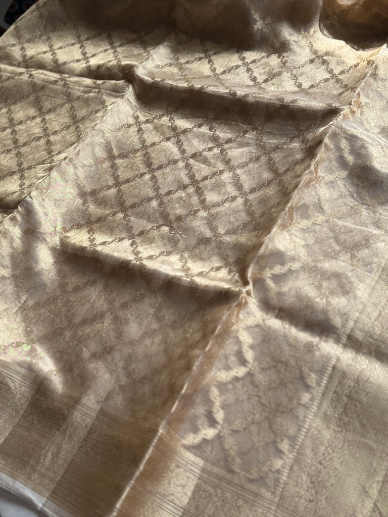 Refined and radiant, this Champagne gold Banarasi tissue saree is adorned with an exquisite diamond jaal pattern, beautifully woven with intricate zari detailing that adds depth and richness to the drape.
