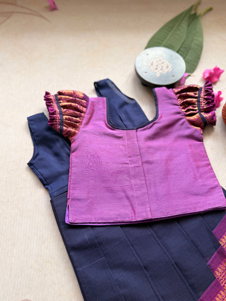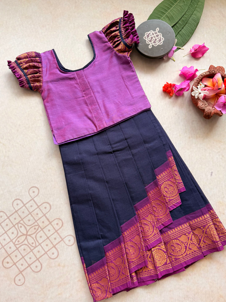 It is paired with an overlapped Chettinad cotton skirt, designed with a contrasting border enhanced with zari detailing, adding a touch of richness to the classic silhouette — perfect for cultural events, festivals, or special occasions.