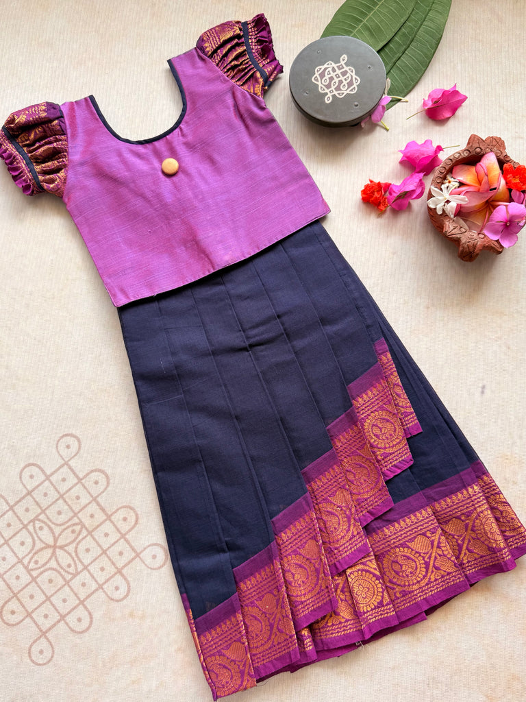 This charming Chettinad cotton skirt and top set blends tradition with elegance. The top is crafted from raw silk, featuring puff sleeves for a graceful, festive look.