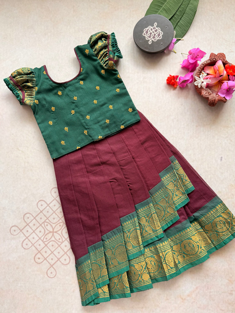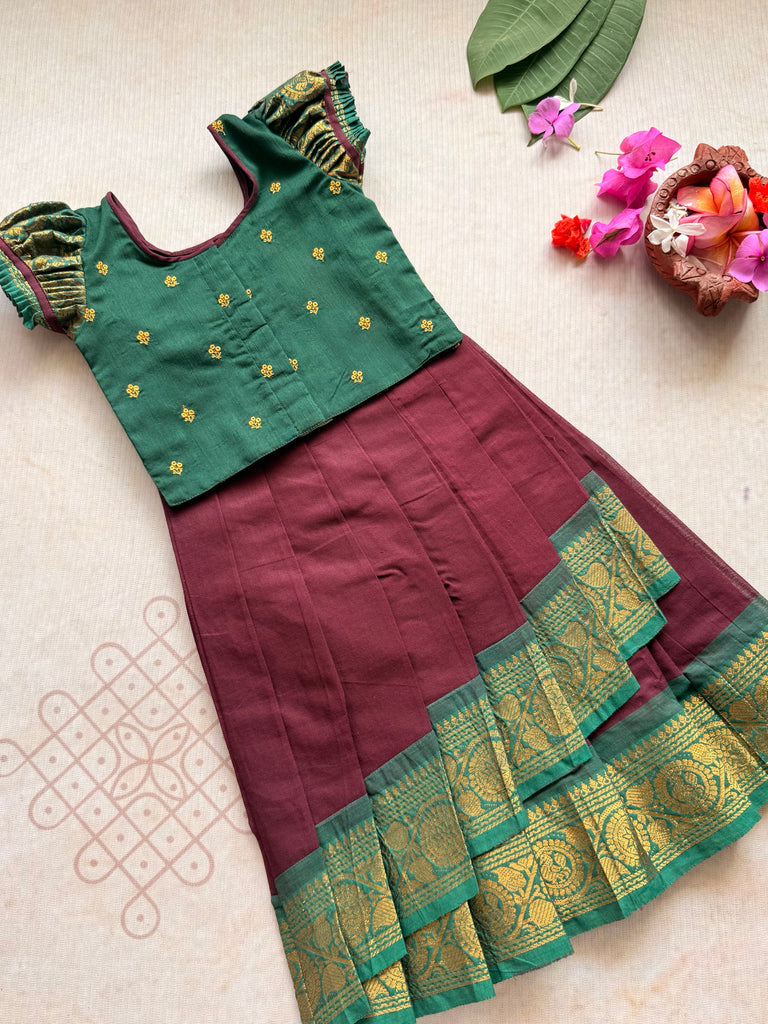 This charming Chettinad cotton skirt and top set blends tradition with elegance. The top is crafted from raw silk, featuring floral embroidery and puff sleeves for a graceful, festive look.