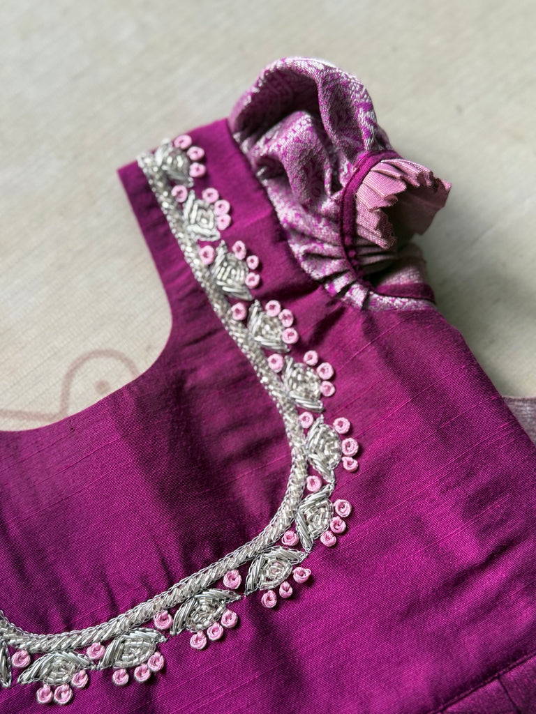 The blouse is beautifully hand-embroidered with silver and pink detailing around the neckline and finished with a charming fabric rosette on the shoulder. A perfect blend of comfort, tradition, and style for your little one.