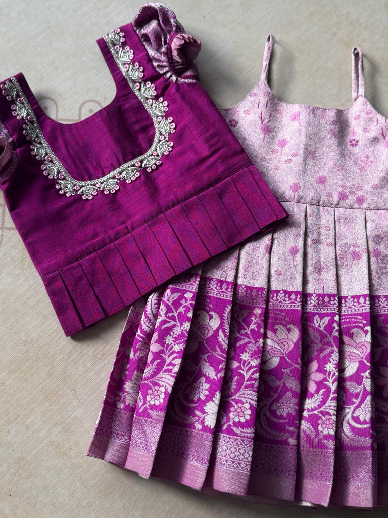 This elegant traditional dress set includes a pleated brocade frock in soft pink and lavender tones, paired with a rich magenta blouse. The frock features delicate floral motifs, making it ideal for festive occasions and celebrations.