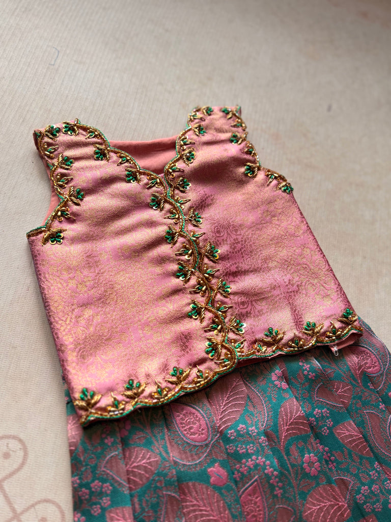 The outfit is paired with a stunning pink silk jacket, highlighted by intricate aari hand embroidery along the scalloped edges with golden and green beadwork for a striking finish. This stylish layering piece adds depth and detail to the ensemble, making it an ideal choice for weddings, festivals, and family celebrations.