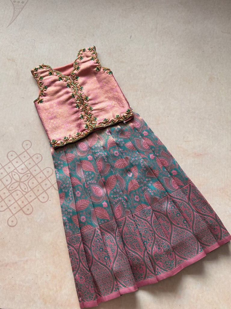 Bring elegance and vibrance to your little one’s wardrobe with this Peacock Green and Pink Silk Frock with Jacket. The frock features a sleeveless design in rich semi-silk fabric, woven with beautiful floral and leaf motifs in shades of peacock green and pink, creating a graceful and festive appeal. Its pleated silhouette ensures both comfort and charm, making it perfect for traditional occasions.